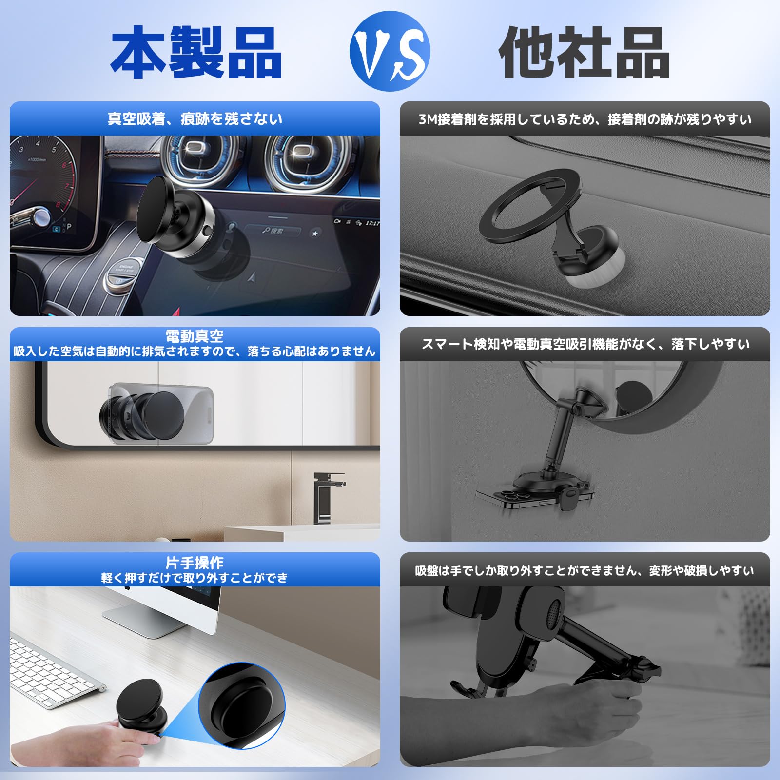 DOUBLE Q 新型 スマホホルダー 電動真空吸盤 磁気吸引 スタンド 携帯電話ホルダー 磁気吸盤 接着テープも不要で iPhone スマホスタンド 吸着式スマホホルダー 真空スマホホルダー 車載ホルダー 吸盤 車 スマホホルダー 磁石 360度回転 iPhone16 15Plus/15ProMax /14/13/12Pro/Maxに対応 (ブラック)