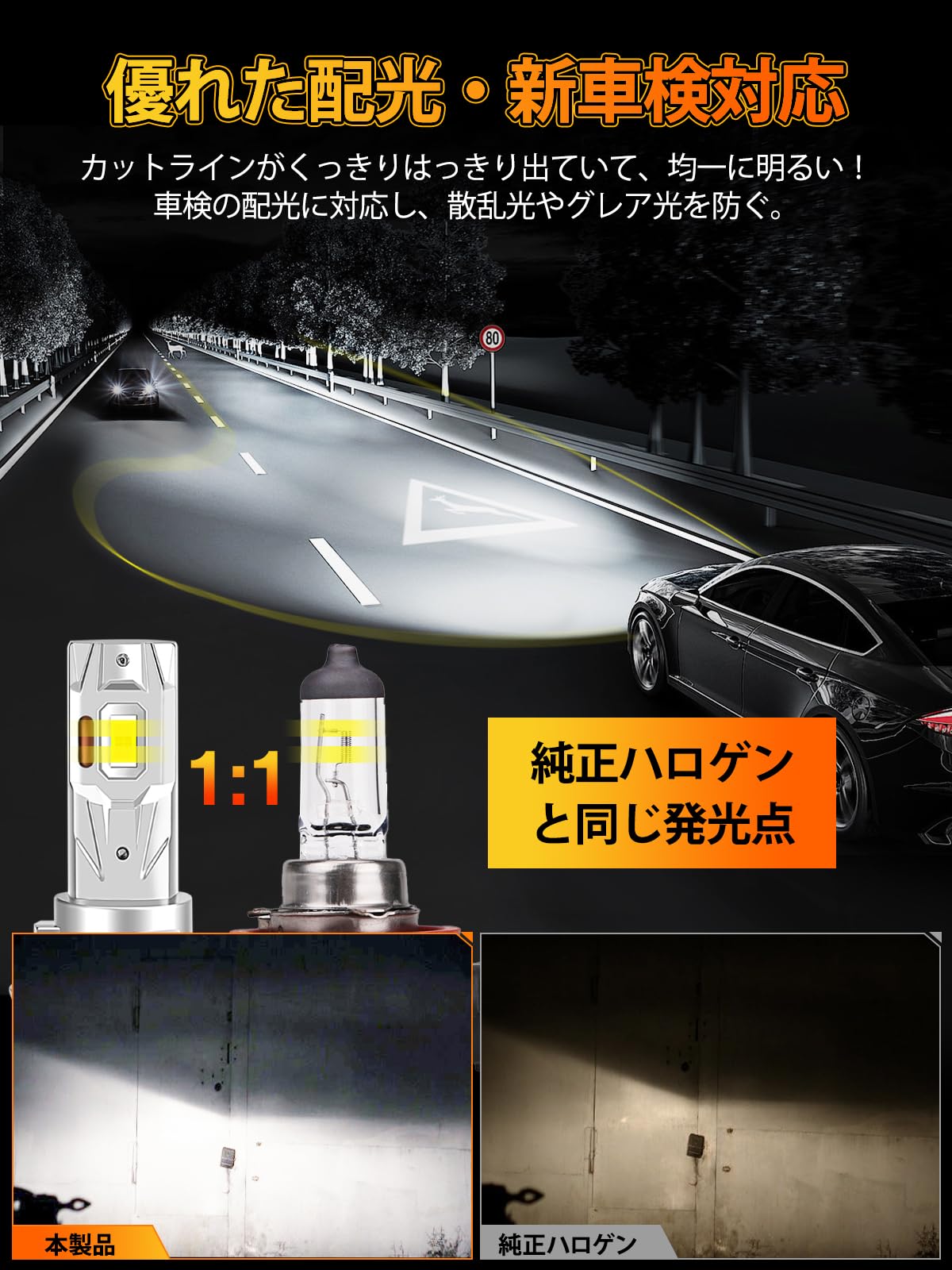 【優れた配光・新車検基準以上】29,900cd(カンデラ)ロービームビームは車検基準の約4,7倍の光量です。96,500cd(カンデラ)ハイビームビームは車検基準の約6,4倍の光量です。 9006 hb4 ledヘッドライトは純正ハロゲンと同じ発光点で、ダークゾーンはありません。カットラインがくっきりはっきり出ていて、均一に明るい!道が明るくはっきり見えるので、目が疲れない!車検対応の配光により、散乱光やグレア光さを防ぎ、対向車が眩しさを感じることがありません。※ご注意※本品は汎用品の為、車種側のリフレクターに依存する形となりますので、照射の形状と車検データは車種により異なる場合がございます。また、車検に関しては、地域により検査員の基準が異なる場合がございます。