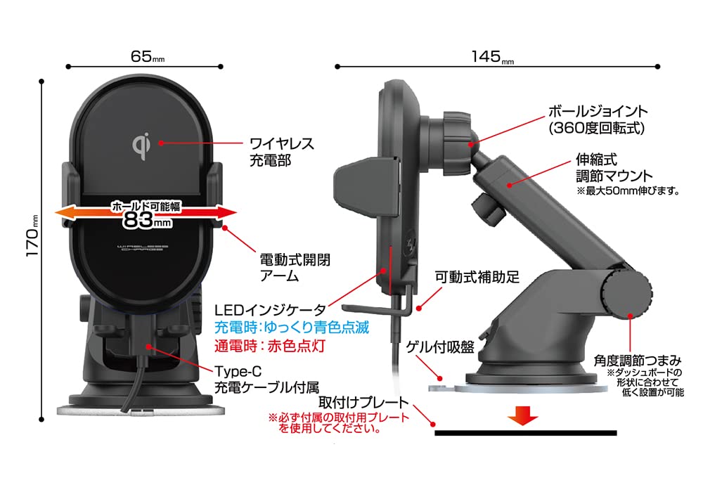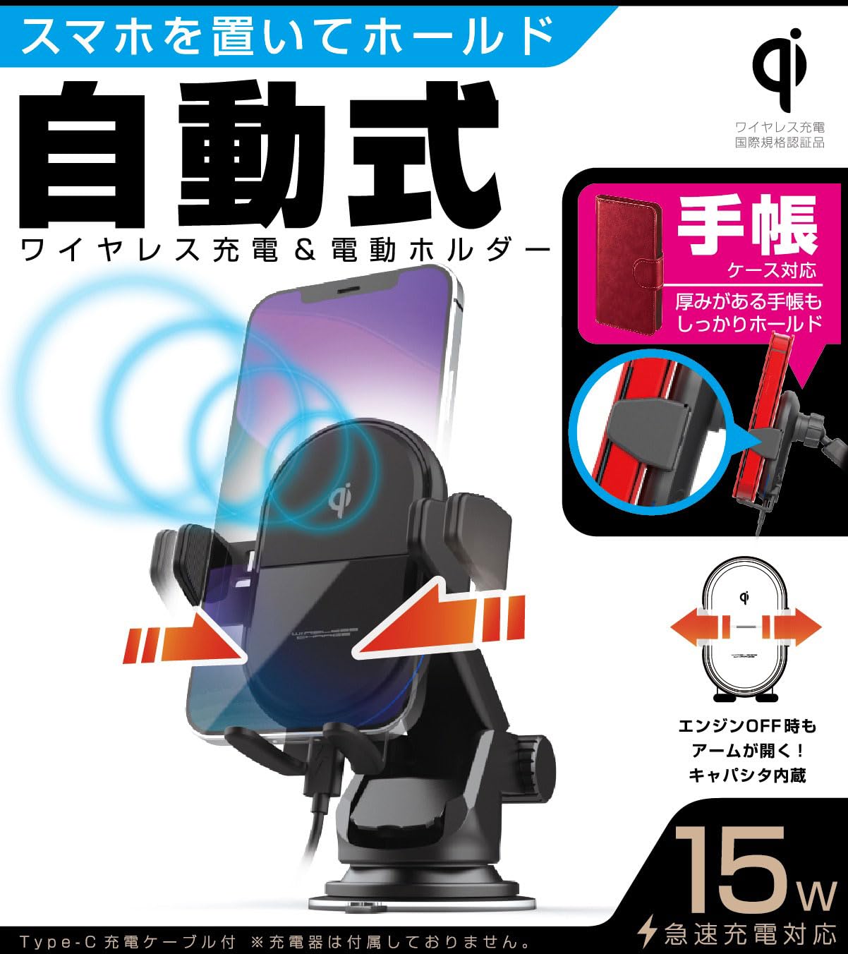 ワイヤレス充電(Qi)対応スマートフォンを置くだけで左右アームが自動でホールド。