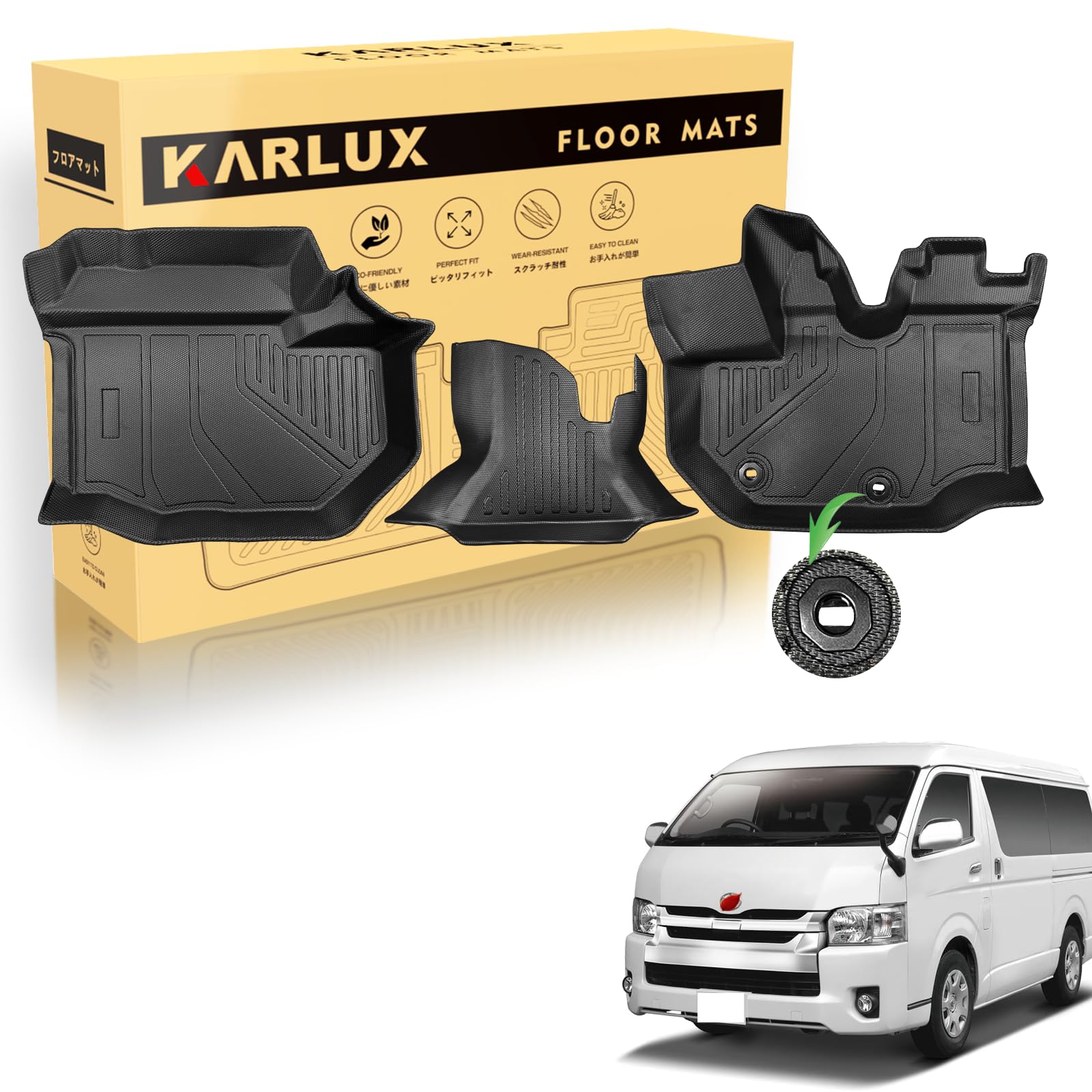 KARLUX トヨタ ハイエース200系ワイドボディ専用のフロアマット。3Dカーマットは防水・防滑・防汚でTPE素材製。トヨタ ハイエース200系S-GL/GL/DX に最適化されたカスタム設計。 (ワイドボディー専用 1列目フロアマット)
