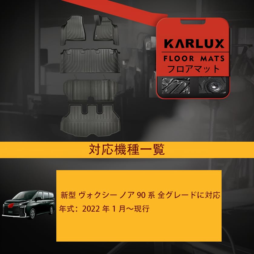 【対応車種】トヨタ 新型 ヴォクシー ノア 90系 全グレードに対応。年式:2022年1月-現行。【セット内容】運転席用1P、助手席用1P、後席用1P、ラゲッジマット1P(4Pセット)。購入前に車の形状、年式、モデルを確認するようお願いします。