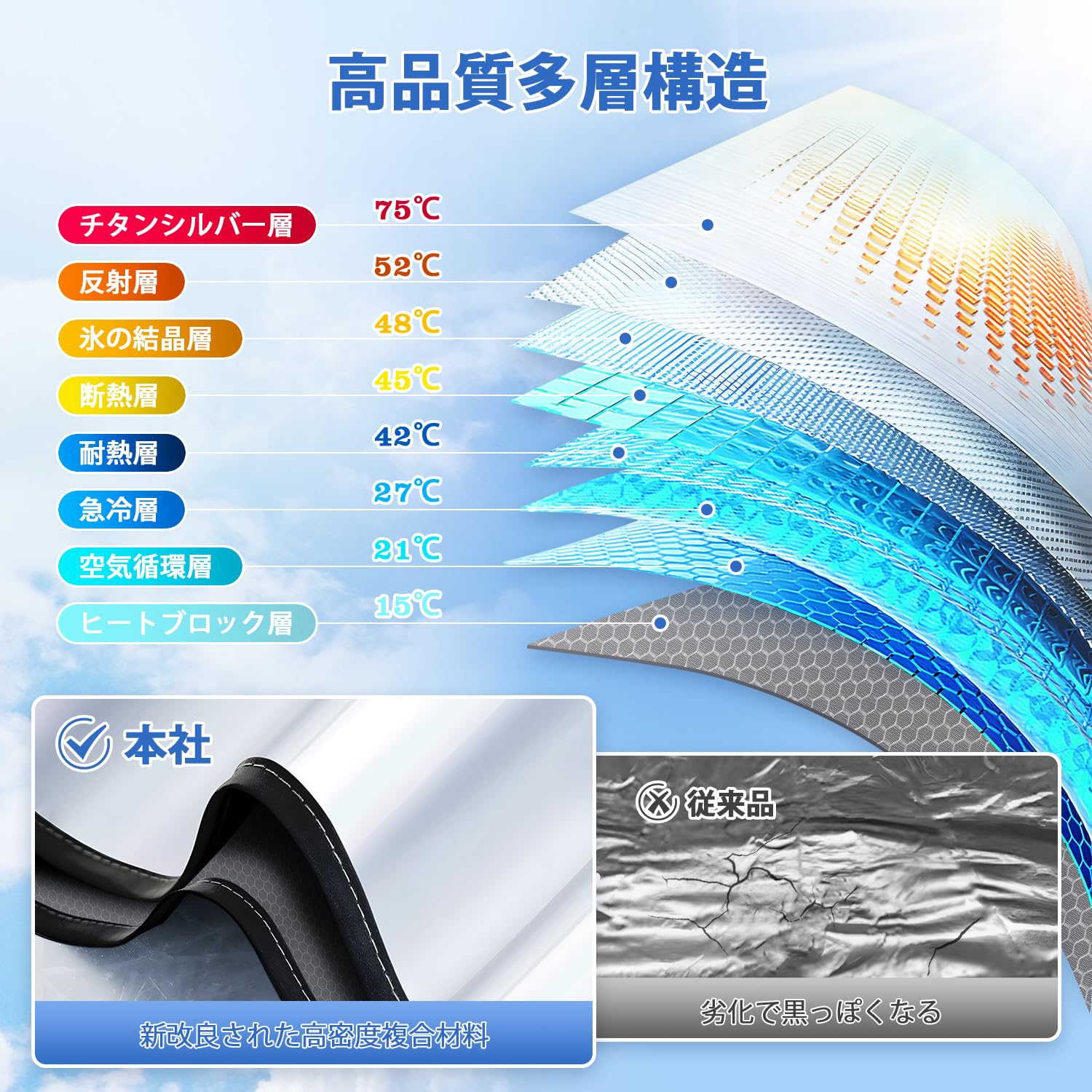 2.「多層構造・ハニカム設計特徴」超耐久多層アルミメッキ・厚手ポリプロピレン不織布を採用、有害な紫外線を効果的にカットし、車内を涼しく保ちます。夏の強い日差しの熱や紫外線を効率よく反射できる。グレー色のハニカム設計、美しさと機能性を兼ね備えている。