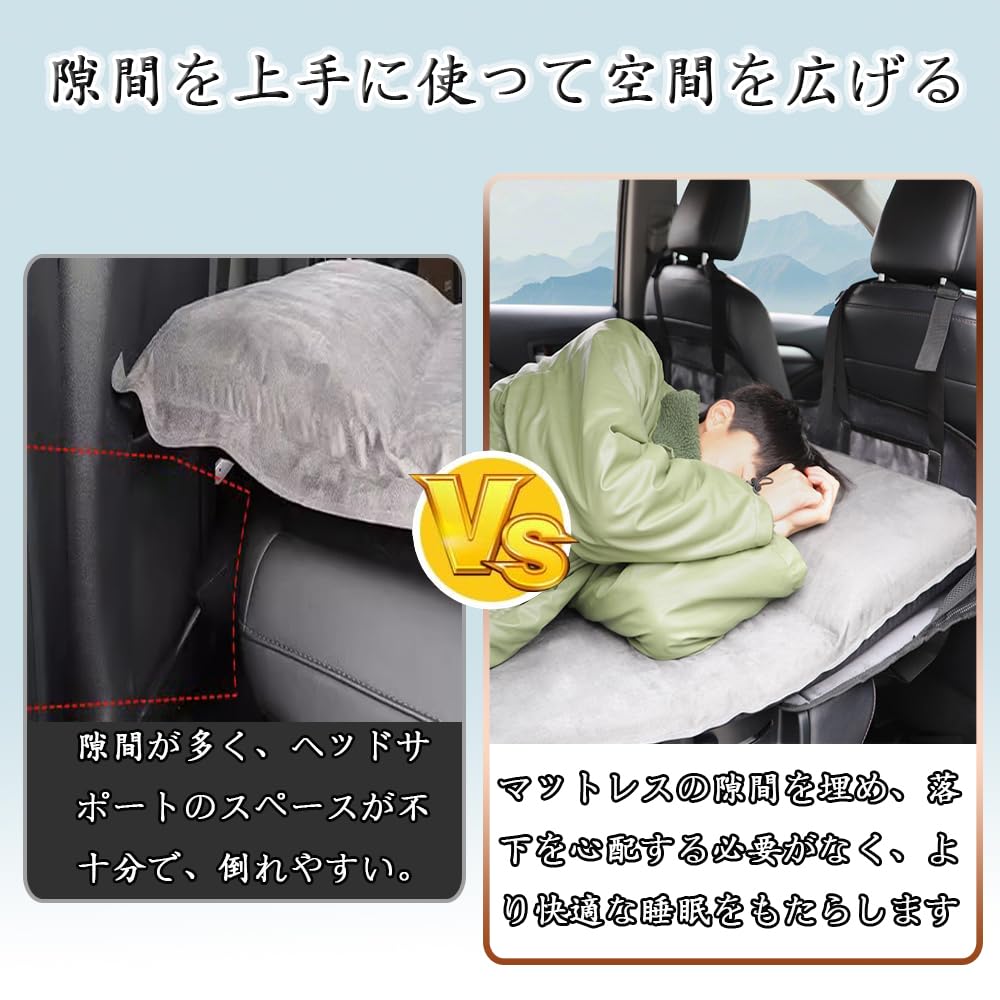 『空気入れ不要』 車中泊 マットは膨張させる必要がありません 、取付は後部座席に敷いて、付属のベルトをヘッドレストにかけるだけです,マットレスの隙間を埋め、落下を心配する必要がなく、より快適な睡眠をもたらします。