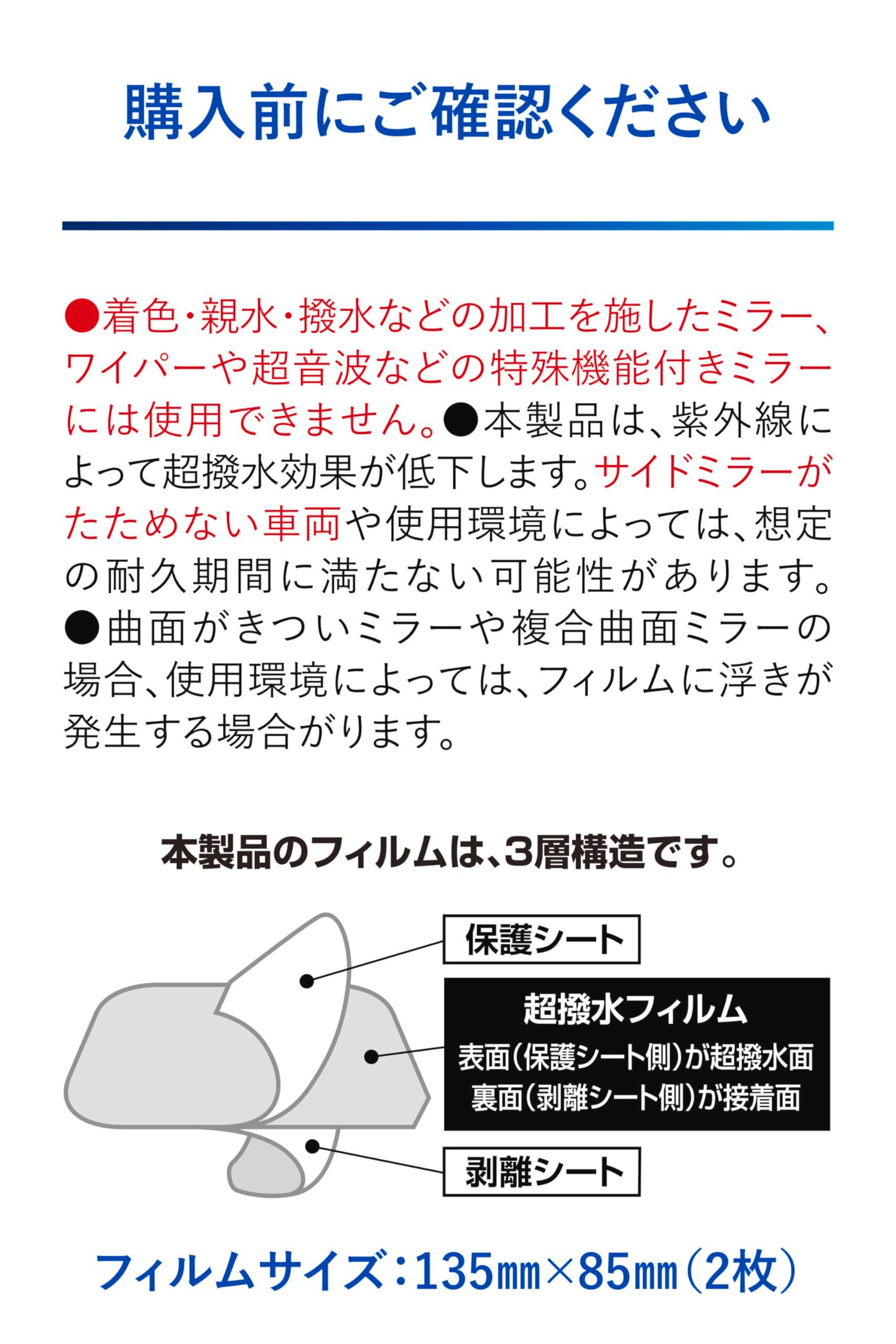 ・本製品は、紫外線によって超撥水効果が低下します。サイドミラーがたためない車両や使用環境によっては、想定の耐久期間に満たない場合があります。