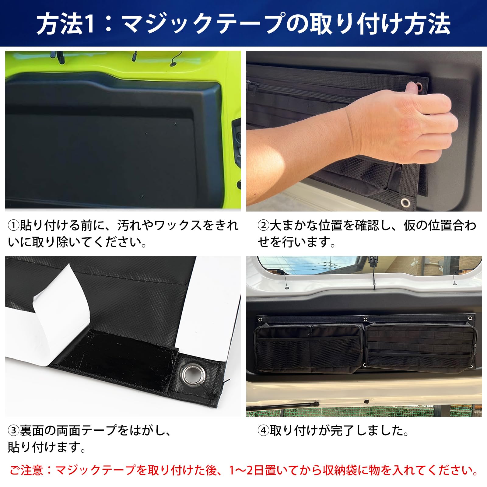 ご注意:警告や注意に従わずに誤った方法でご使用された場合、発生した事故や故障、破損等に関しては、当社は一切責任を負いませんし、保証もいたしかねます。「マジックテープで取り付ける」:1:貼り付ける前に、汚れやワックスをきれいに取り除いてください。2:まず、大まかな位置を確認し、仮の位置合わせを行います。3:裏面の両面テープをはがし、貼り付けます。4:取り付けが完了しました。