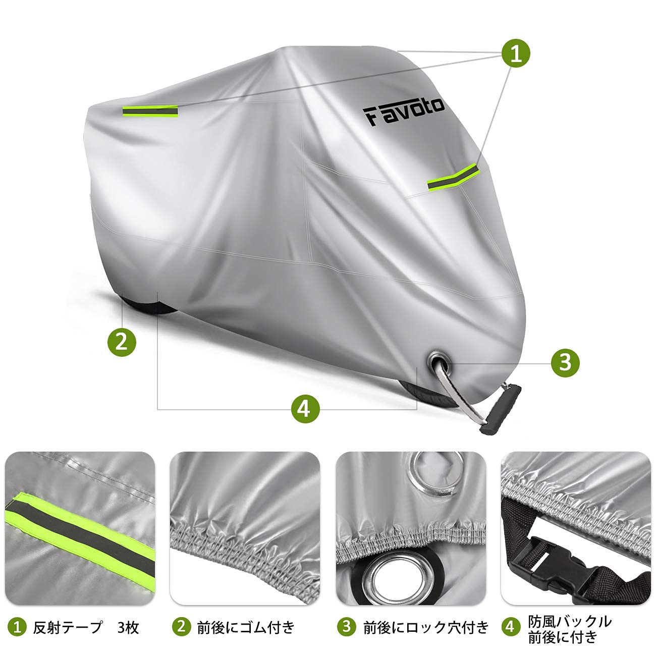 Favoto バイクカバー 厚手 ワンタッチバックル前後付き 反射ストライプ3枚 UVカット 高防風 防埃 防雨 防雪 丈夫 盗難防止 収納袋付き (シルバー XXL-245*105*125cm)