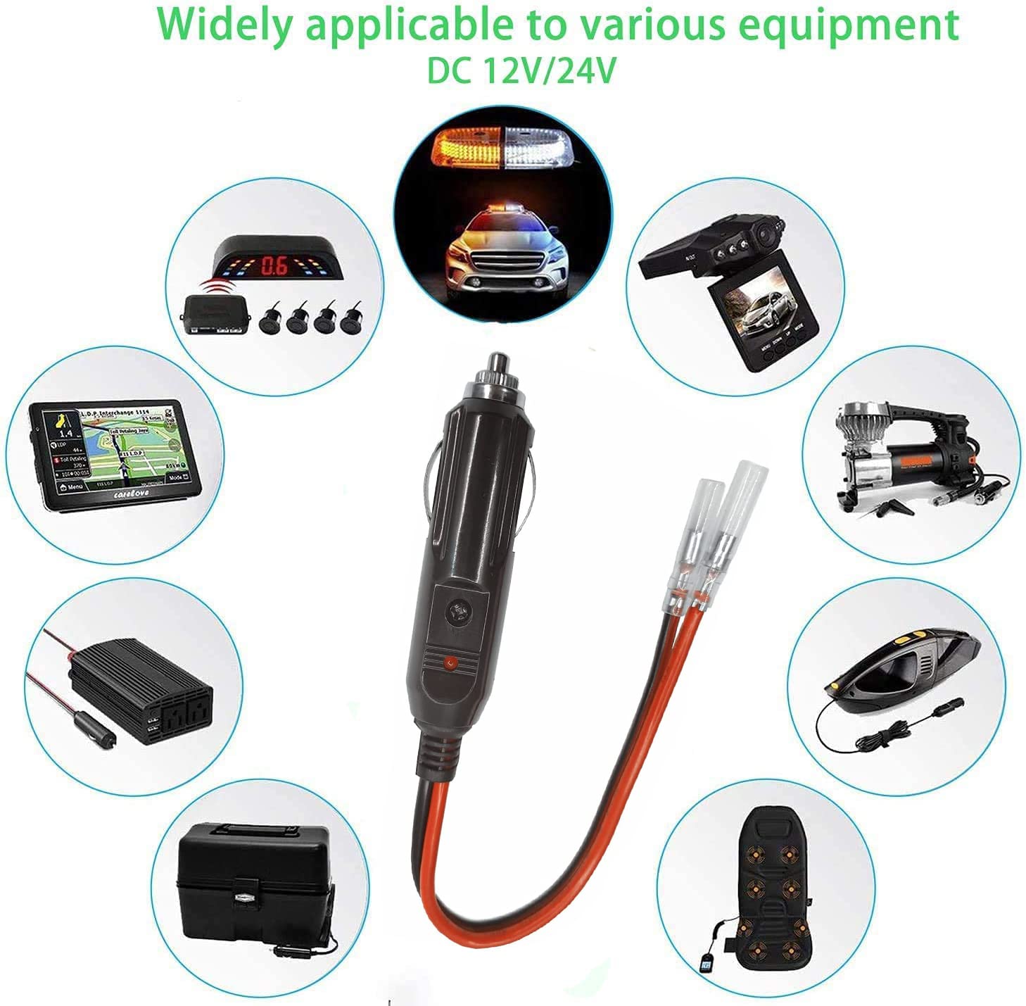 自動車や船舶などのさまざまなDC12V / 24V機器に接続するために広く使用されています,に適用する GPS、空気清浄機、クッション、電気カップ、電気ケトル、周波数変換器など電源配線。 LEDインジケータ付きで、使用中に電源が正常かどうかを確認するのに便利です。 15aヒューズがプラグに組み込まれています,使用する方が安全です。