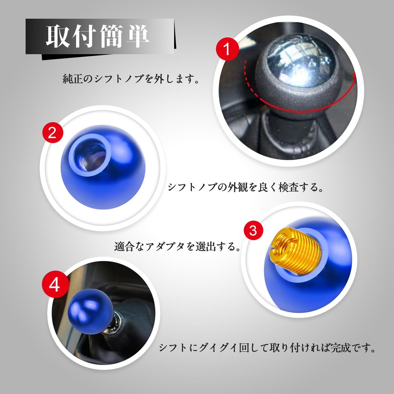 【装着簡単 4つアダプター】ねじ込み式なので、純正のシフトノブに締め込むだけで簡単に取り付けます。 4つアダプタ-のサイズ: M12xP1.25(トヨタ・スバル・スズキ・ダイハツに対応)、M8xP1.25(ゲート式AT車に対応)、M10xP1.25(日産・マツダ・三菱に対応)M10xP1.5(ホンダに対応 )