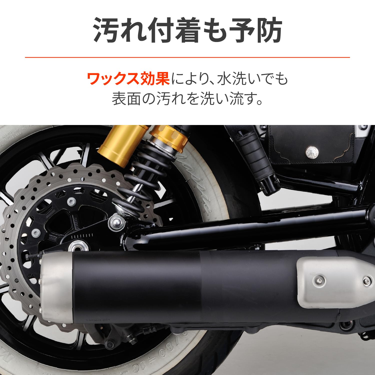 オートバイのエンジン・マフラー等のツヤ出し保護剤です。優れた耐熱性オイル状高分子被膜の形成により、270℃においても、ツヤが長持ちします。水洗いで簡単に表面の汚れを洗い流すことができます。