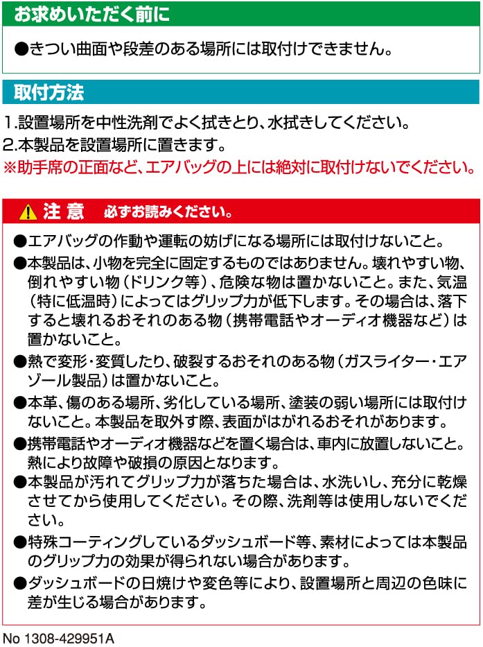 ●エアバッグの作動や運転の妨げになる場所には取付けないこと●本製品は小物を完全に固定するものではありません。壊れやすい物、倒れやすい物(ドリンク等)、危険な物は置かないこと。また気温(特に低温時)によってはグリップ力が低下します。その場合は、落下すると壊れるおそれのある物(携帯電話やオーディオ機器など)は置かないこと●熱で変形・変質したり、破裂のおそれのある物(ガスライター・エアゾール製品)は置かないこと●本革、傷のある場所、劣化している場所、塗装の弱い場所には取付けないこと。本製品を取外す際、表面がはがれるおそれがあります●携帯電話やオーディオ機器などを置く場合は、車内に放置しないこと。熱により故障や破損の原因となります●本製品が汚れてグリップ力が落ちた場合は、水洗いし、充分に乾燥させてから使用してください。その際、洗剤等は使用しないでください●特殊コーティングしているダッシュボード等、素材によっては本製品のグリップ力の効果が得られない場合があります●ダッシュボードの日焼けや変色等により、設置場所と周辺の色味に差が生じる場合があります