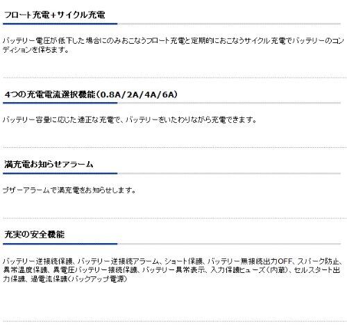 誰でも安心! バッテリーに繋いでコンセントに差したら充電モードを選ぶだけでとっても簡単に使える充電器。8段階自動充電制御でバッテリーの状態を診断しながら最適な充電を行ないます。充電終了後もコンセントに差したままで「フロート充電」+「サイクル充電」で、いつでも最適なバッテリーコンディションを保ちます。セルスタート機能付き(エンジン始動用補助電源)。4つの充電電流選択機能(0.8A/2A/4A/6A)、適合バッテリー容量(2.3Ah?90Ah)