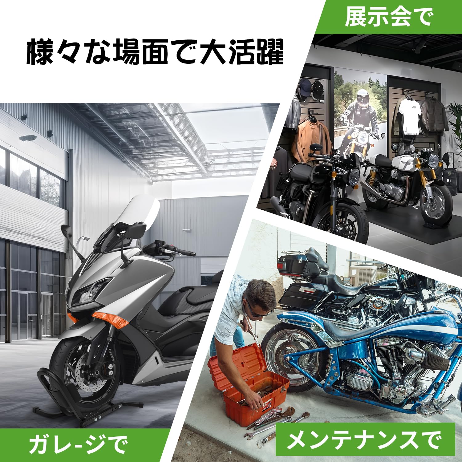 【適用範囲が広い】バイクを安全かつ簡単に支えることができ、バイクの直立運搬、メンテナンス、保管のために設計されています。また、様々な展示会でも利用できます。