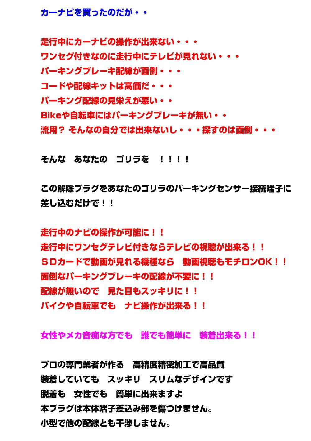 ※バックカメラを接続している場合は使用出来ません。 ※適合は商品説明分に記載あり(適合確認をしてください) 本製品は運転手以外の方に ナビ操作やテレビ視聴を可能にする 解除プラグです。運転者は画面の直視やナビ操作 法律違反にならないようにご注意ください。黒い先端部分はABS製の為 型から抜く際に出るバリや薄いキズがある場合がございますが ご了承くださいませ.