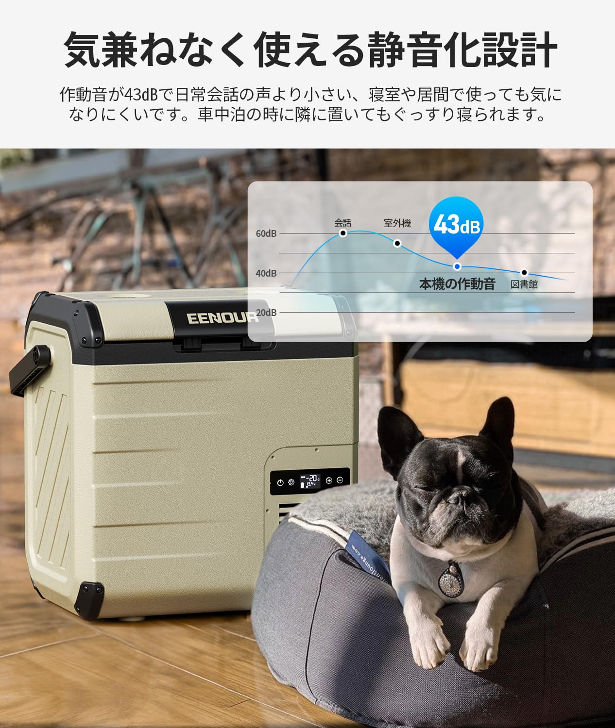 ??【アウトドアや家の中で大活躍する】柔らかで優しげなベージュ色とクールな黒を採用し、お洒落で自然にもインテリアにもなじみやすい、飽きずに長く使用できます。ボディーの周りに保護カバーが付き、耐摩耗性や耐衝撃性に優れ、様々なキャンプ場に対応できます。蓋を開くと、庫内灯が自動的に点灯し、庫内を明らかに照らします。夜中で飲食物をスムーズに取り出せます。運転音が最大限に43?まで抑え、ワンルームでも気にならず夜もゆっくり眠れます。