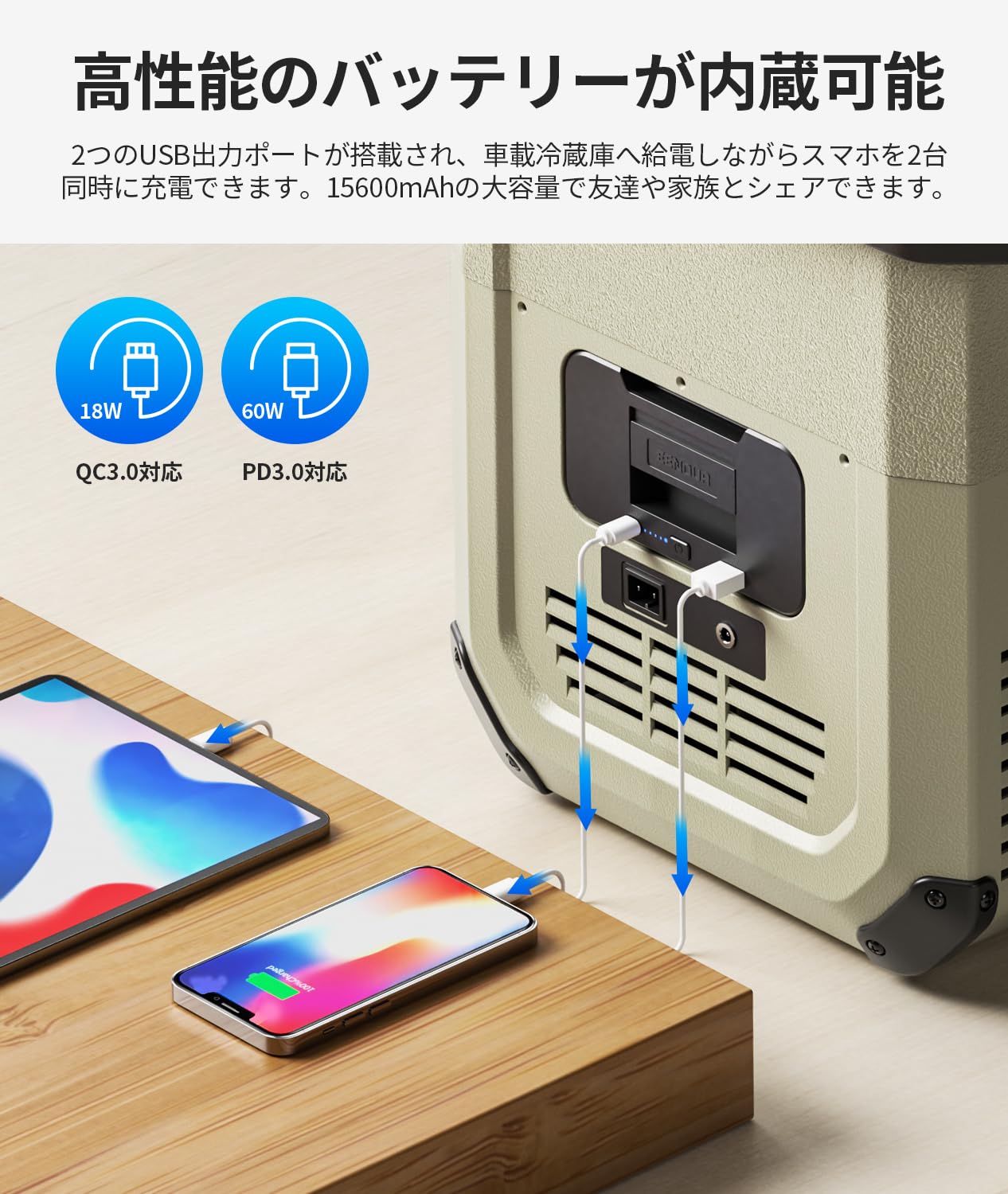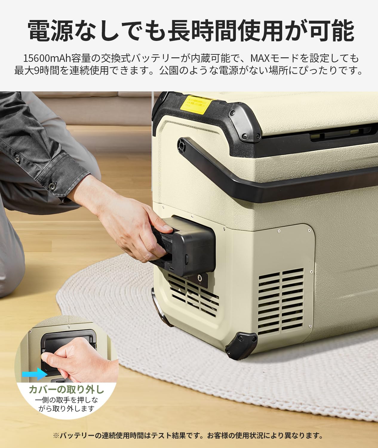 ??【バッテリー駆動でとごでも使える】別売りの専用バッテリーを取り付けると、庭、海辺やキャンプ場など電源のない場所でも使えます。大容量バッテリーなので、9時間以上連続駆動することができます。それに、停車時には自動的にバッテリー駆動に切り替わり、庫内を冷やし続けられます。ポータブル電源から引っ張る必要がないので使い勝手抜群です。また、ソーラーパネルより充電でき、電力不足の心配がありません。アウトドアでの長期滞在が可能になり、停電や災害の時にも役に立ちます。