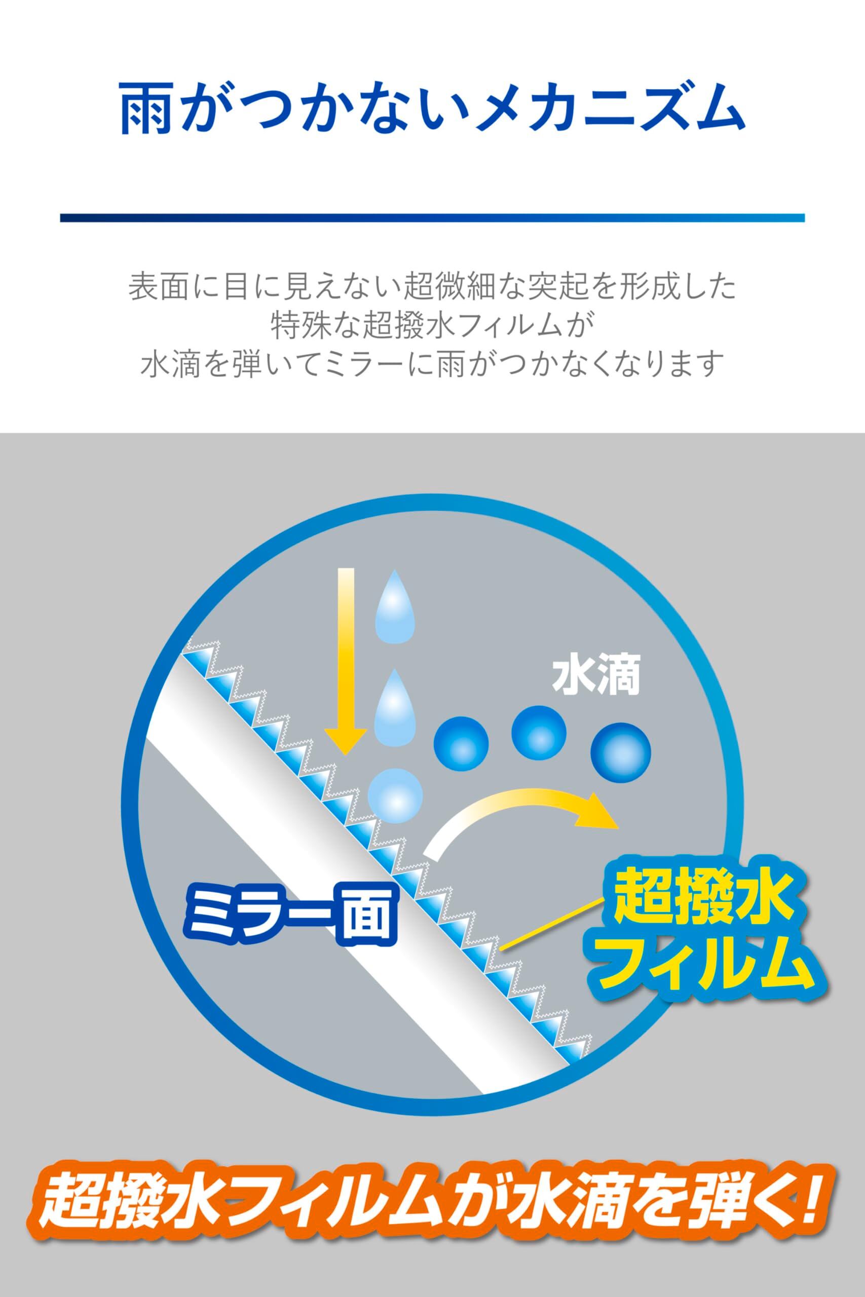 ◆雨がつかない超撥水フィルム 表面に超微細な突起を形成した特殊な超撥水フィルム。 停車中(0km/h)でも雨がつかないので、雨の日の視界がすっきりクリア。 風が当たりにくいサイドミラーに最適です。