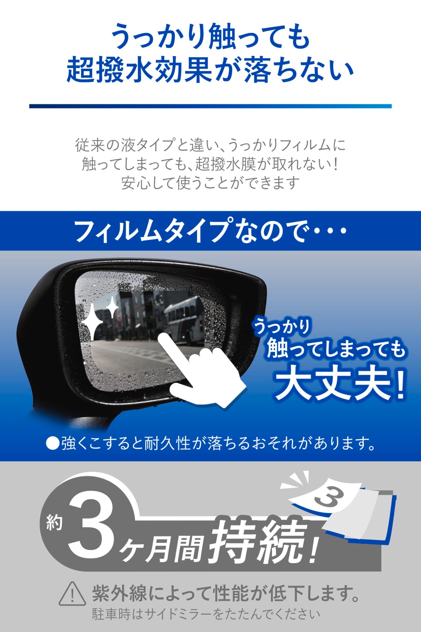 ・本製品は、紫外線によって超撥水効果が低下します。サイドミラーがたためない車両や使用環境によっては、想定の耐久期間に満たない場合があります。