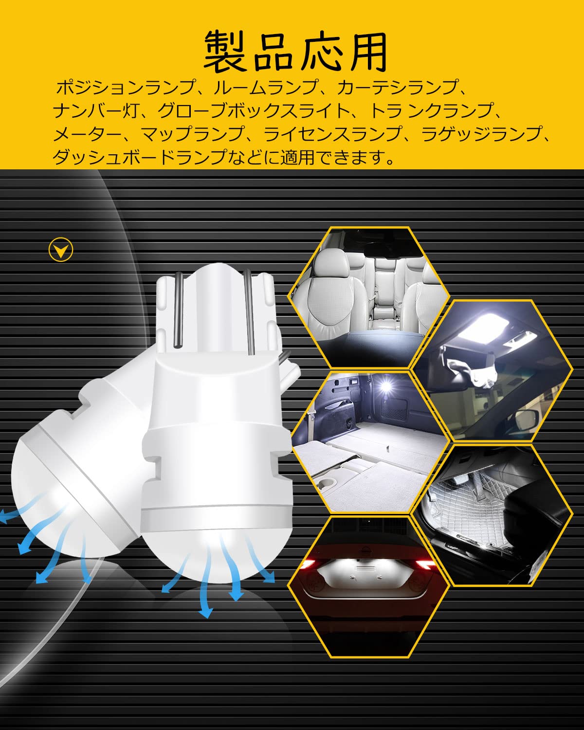 ??応用:ポジションランプ、ルームランプ、カーテシランプ、ナンバー灯、グローブボックスライト、トラ ンクランプ、メーター、マップランプ、ライセンスランプ、ラゲッジランプ、ダッシュボードランプなどに適用できます。