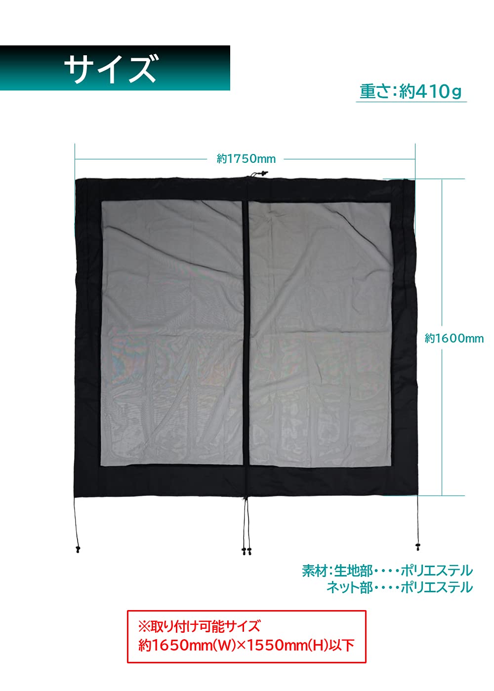 [ 商品サイズ ] 約1750(W)×1600(H)mm、[ メッシュ部 ] 防虫加工JIS規格適合、[ 取り付け可能サイズ ] 約1650(W)×1550(H)mm、[ ファスナー位置 ] 商品中央、[ 本体重量 ] 約410g、[ パッケージサイズ ] 約210(W)×300(H)×65(D)mm