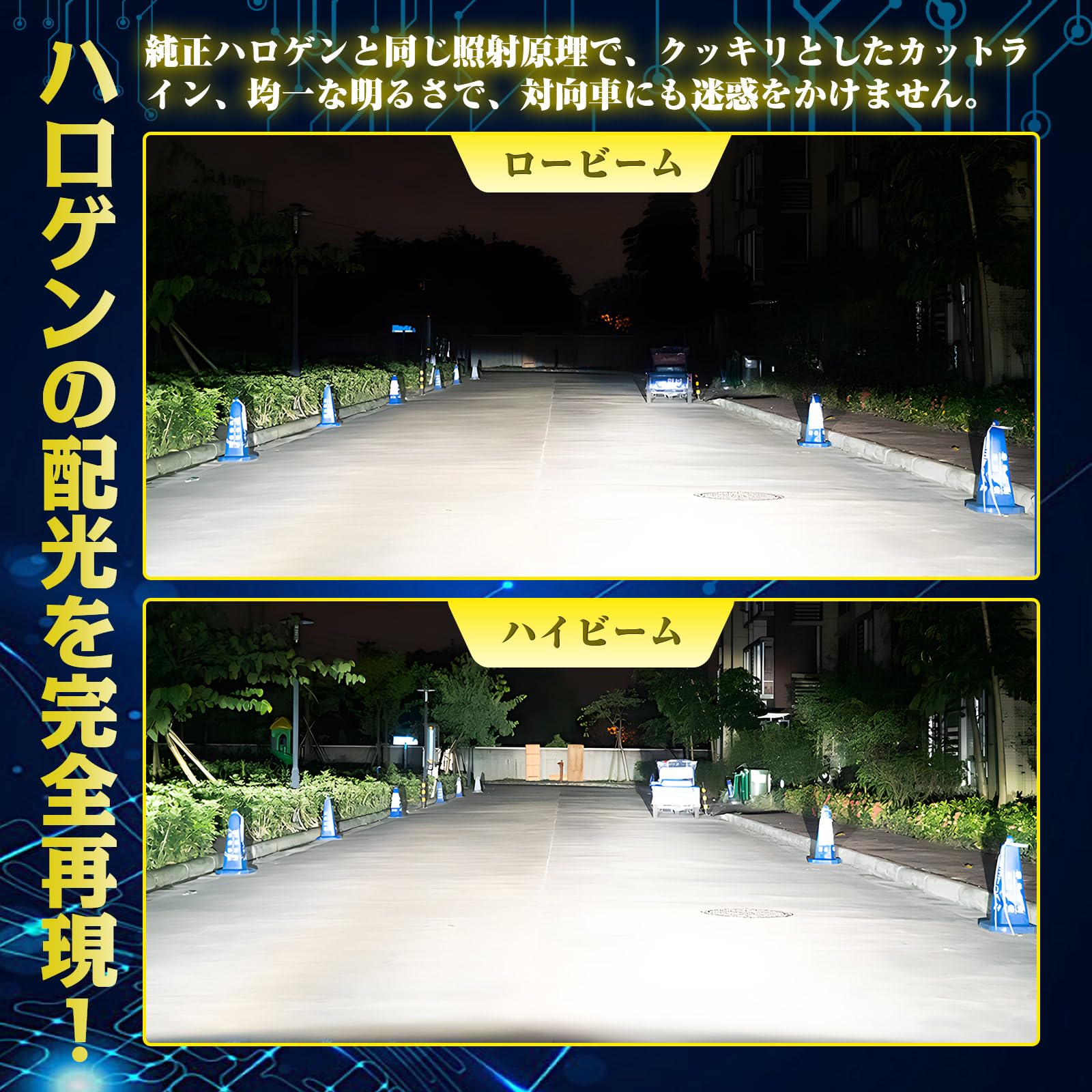 【優れた配光&新車検対応】「対向車に迷惑をかけたくない」「車検が通らないかも…」と不安な方へ。ハロゲンと同じ1:1設計と正確な発光点で、眩しすぎず、美しいカットラインを実現。新基準車検にも対応し、安心してお使いいただけます。(※本品は汎用品の為、車種側のリフレクターに依存する形となりますので、照射の形状は車種により異なる場合がございます。また、車検に関しては、地域により検査員の基準が異なる場合がございます。)
