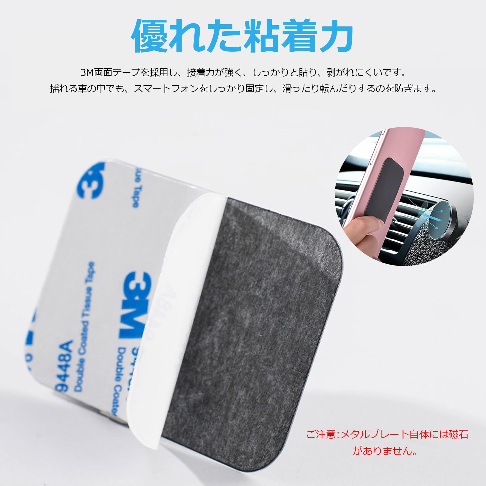 【優れた粘着力】3M両面テープを採用し、接着力が強く、しっかりと貼り、剥がれにくいです。揺れる車の中でも、スマートフォンをしっかり固定し、滑ったり転んだりするのを防ぎます。接着強度を最大限に発揮するために、貼り付け後約24時間使用してください。