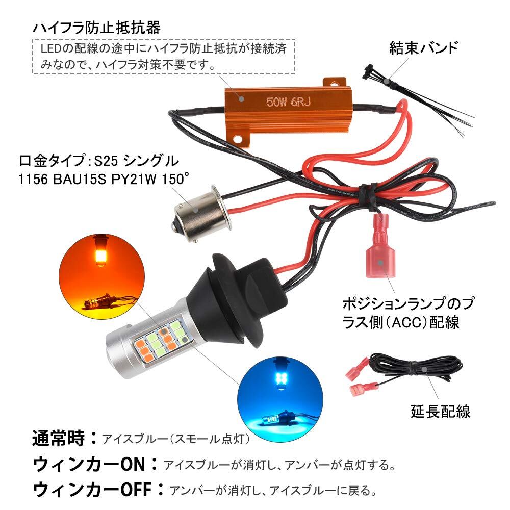『商品仕様』口金タイプ:S25 シングル 1156 BAU15S PY21W ピン角違い150度 / 発光色:アンバー&アイスブルー / LEDチップ:2835SMD / LEDチップ数:42連 / 入力電圧:DC12V / 消費電力:(ポジション)0.228A×12V=2.736W、(ウインカー)2.14A×12V=25.68W / 保証:100日保証。