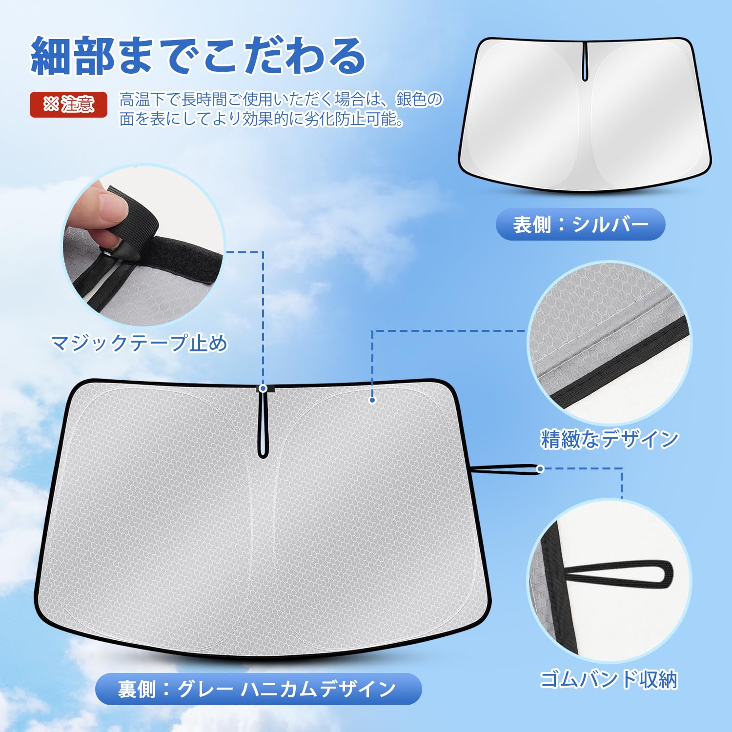 2.「多層構造・ハニカム設計特徴」超耐久多層アルミメッキ・厚手ポリプロピレン不織布を採用、有害な紫外線を効果的にカットし、車内を涼しく保ちます。夏の強い日差しの熱や紫外線を効率よく反射できる。グレー色のハニカム設計、美しさと機能性を兼ね備えている。