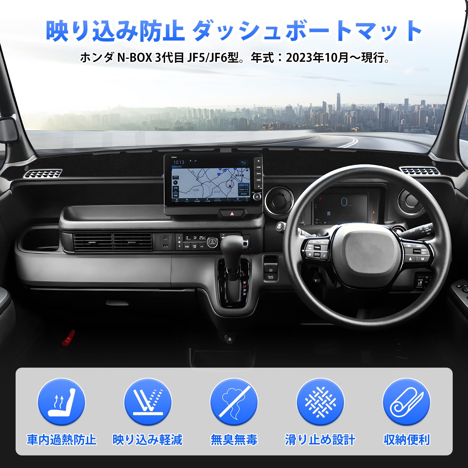 ??1.【適合車種】ホンダ N-BOX 3代目 JF5/JF6型。年式:2023年10月〜現行。※サンシェード内蔵大型ルーフコンソールを取り付けた車には適合しません。※購入する前、年式とモデルを確認してください。※【セット内容】ダッシュボードマットx 1枚セット。