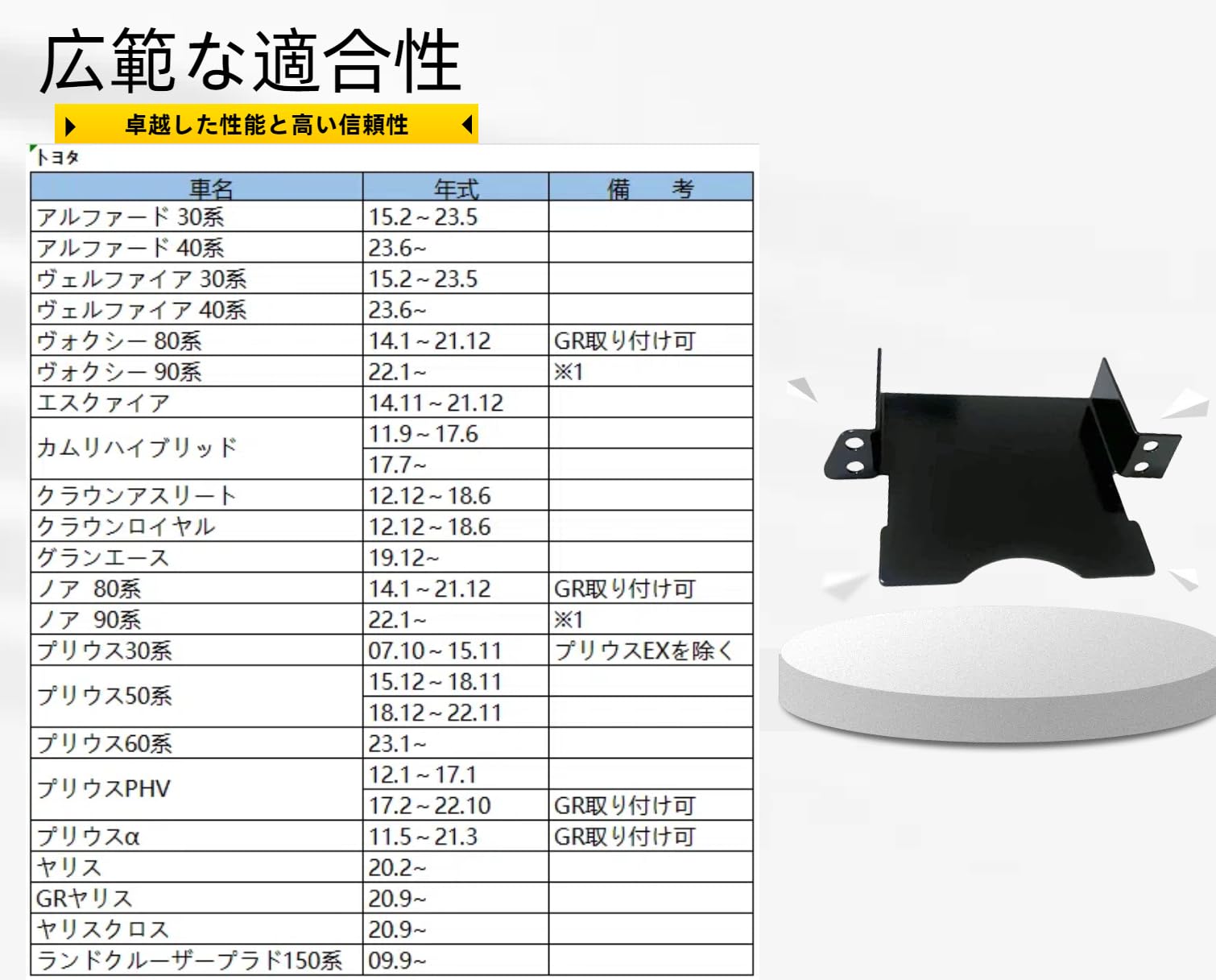 【対応可能な車種】アルファード 30系(15.2〜23.5)/40系(23.6〜)、ヴェルファイア 30系(15.2〜23.5)/40系(23.6〜)、ヴォクシー 80系(14.1〜21.12)/90系(22.1〜)、エスクァイア(14.11〜21.12)、カムリハイブリッド(11.9〜17.6/17.7〜)、クラウンアスリート(12.12〜18.6)、クラウンロイヤル(12.12〜18.6)などに適用可能です。ご自身の車種を確認の上、安心してご購入ください。