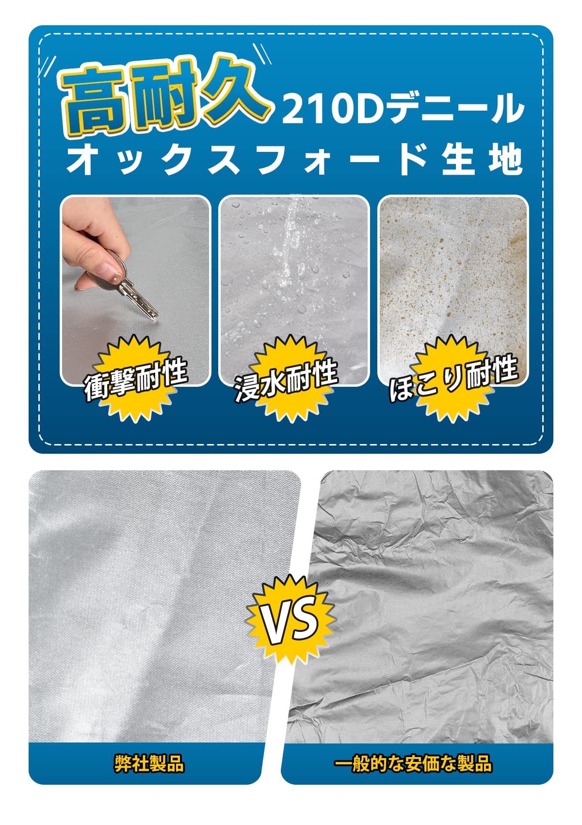 【タイヤカバー★屋外保管専用210D生地】AutoGo タイヤカバーは210Dの100%オックスフォード繊維で作られております。3~5年の優れた耐久性!生地は最先端のシルバーコーティング加工が施されていて、耐摩耗性と耐久性に優れております。しっかりとした生地を採用しているため、屋外に置いているとき風が強いと砂、塵、埃などが飛んで来て擦れても簡単に破れにくく、雨や雪、ほこりなどからタイヤを守ることができます。タイヤを屋内で保管する場合も、湿気、虫や蟻を防げて、汚れることなく安心に保管可能です。