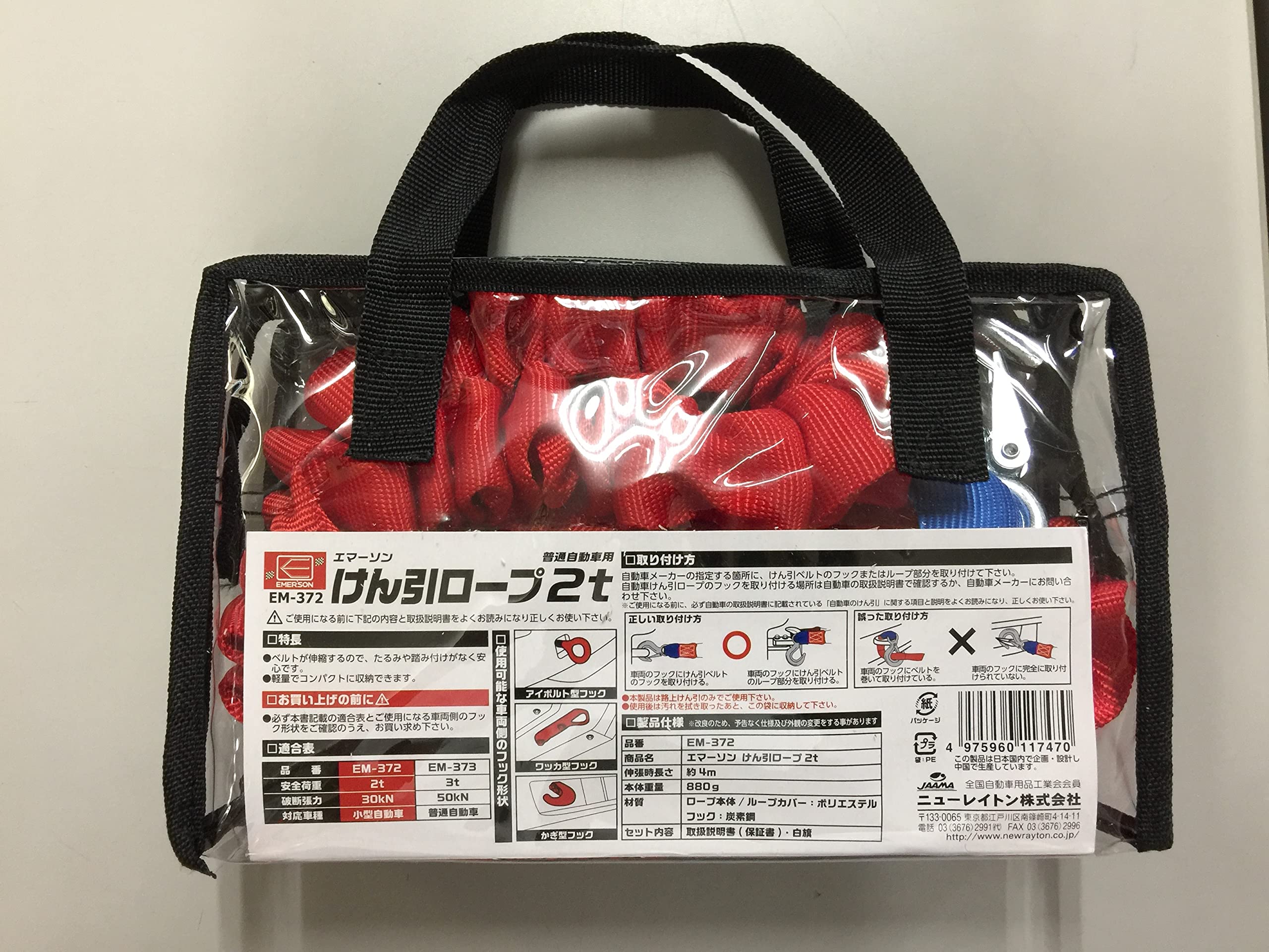 取付方法:車両のフックにけん引ロープのフックを取り付ける。またはけん引ロープのループ部分を取り付ける。車両のフックに正しく取り付けられているか確認して下さい。車両のフックにベルトを巻いて取付ないで下さい。取付時の注意:自動車メーカーの指定する箇所に、けん引ロープのフックまたはループ部分を取り付けて下さい。自動車けん引ロープのフックを取り付ける場所は自動車の取扱説明書で確認するか、自動車メーカーにお問合せ下さい。