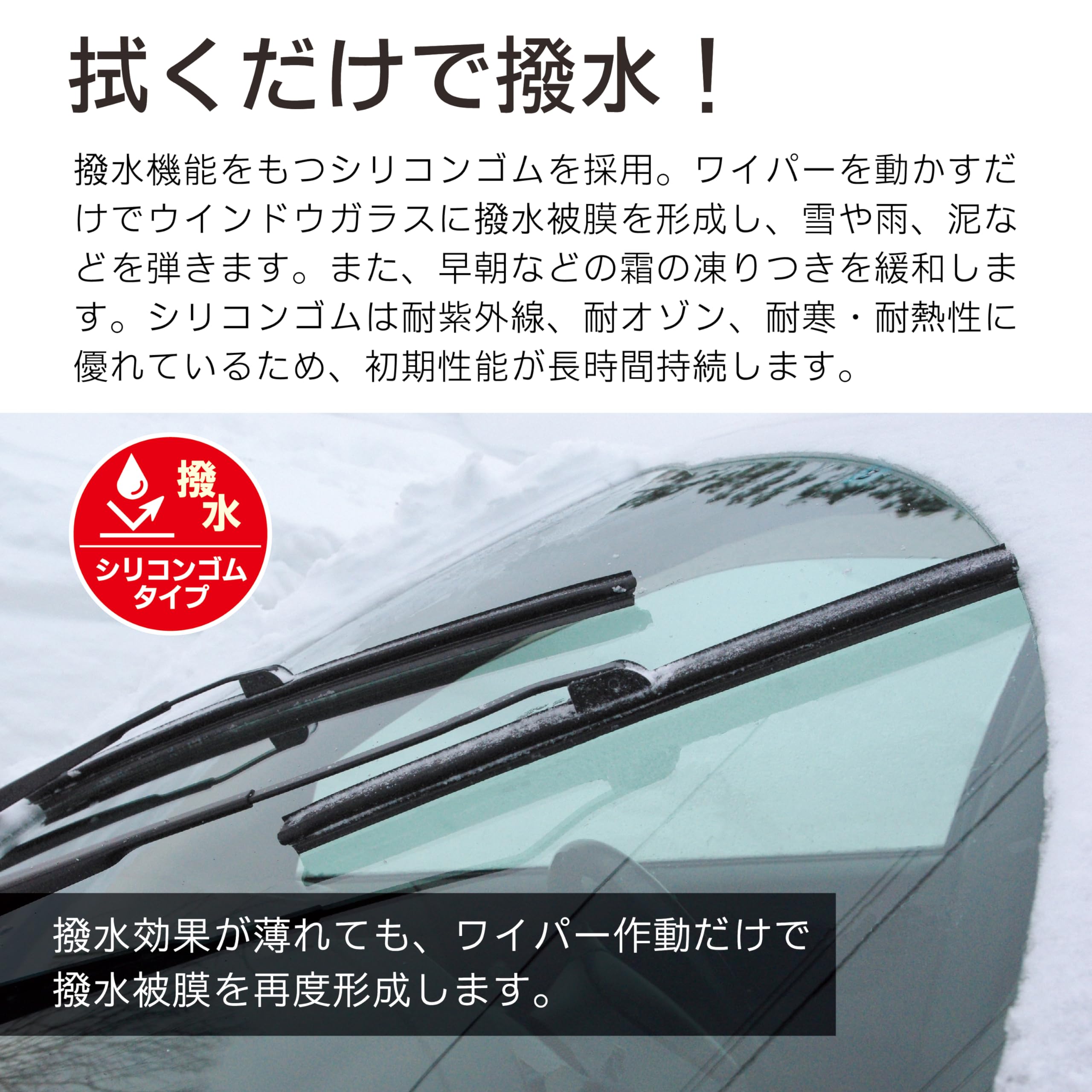 ワイパー作動のみでウインドウガラスに撥水膜を形成し、雪や雨、泥ハネをはじきます。また、撥水膜の効果で氷、霜の凍りつきを緩和します。