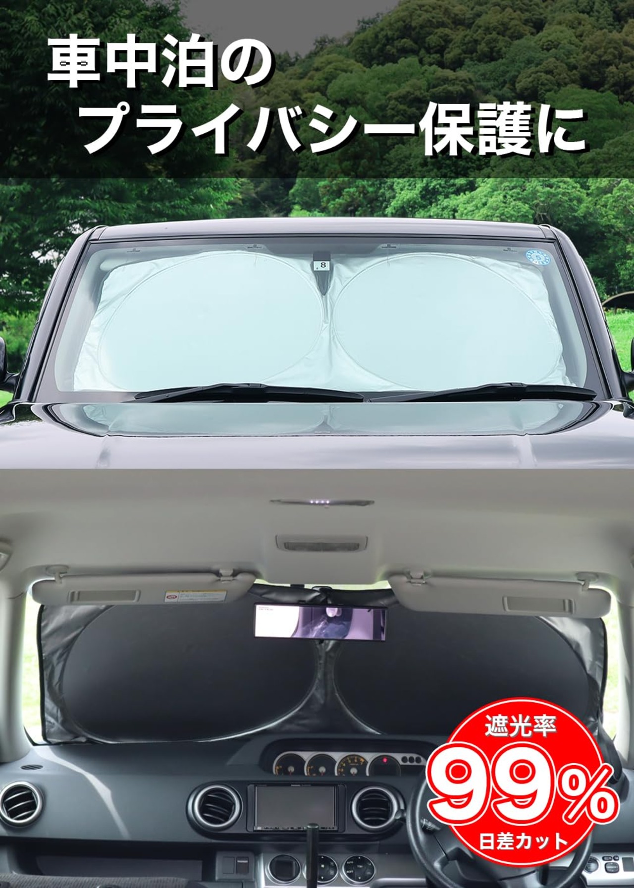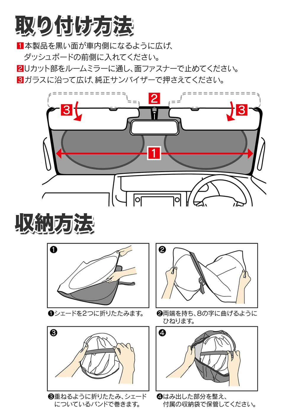 ●ドライブレコーダー等を装着したままでも干渉せず、日除けを簡単に装着できる。