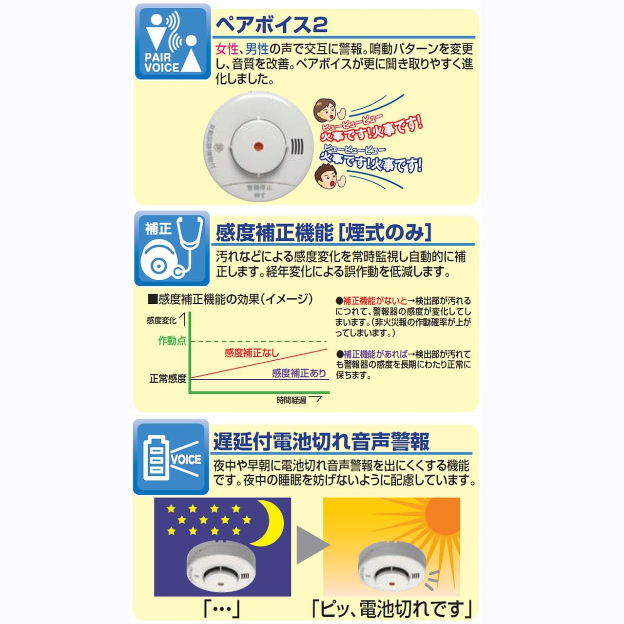 男性、女性の声と光で火災を知らせる