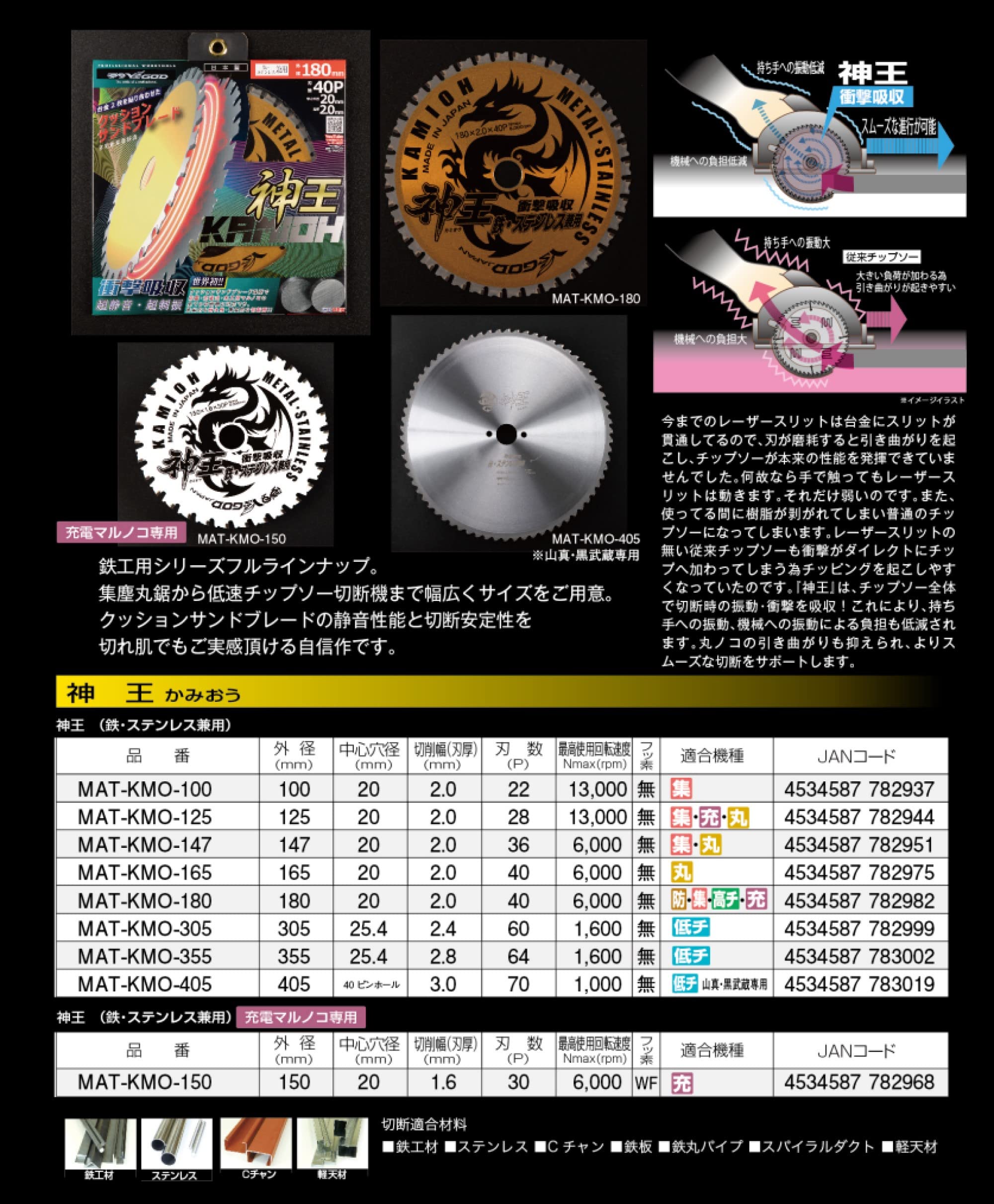 『神王』は衝撃波をチップソー全体で吸収!持ち手への振動、機械への振動による負担も低減されます。引き曲がりも抑えられ、スムーズな切断をサポートします。だから耐久性や切断面が違うのです!