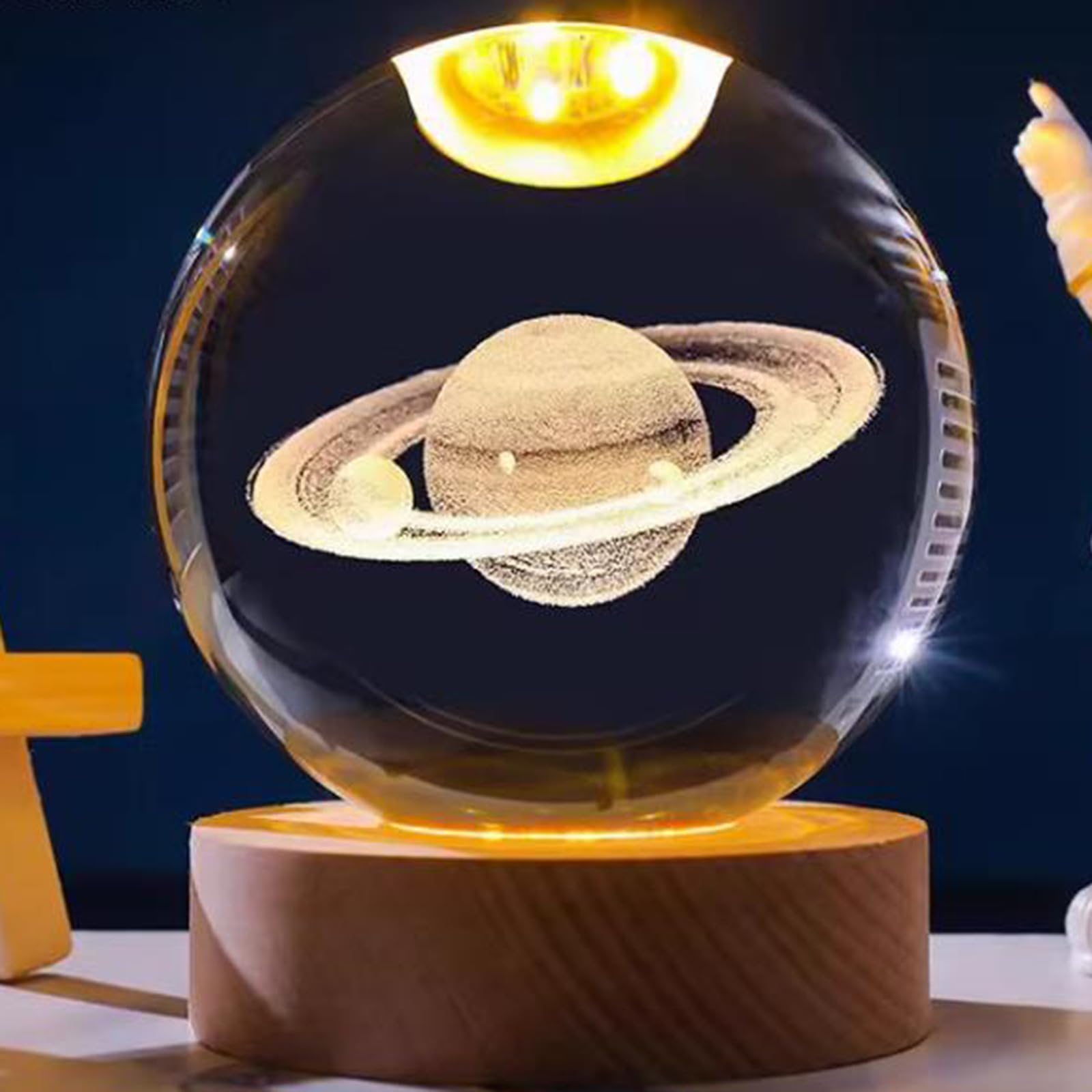 付属のLED内蔵木製台座より光を照射し、3D彫刻が光を拡散して繊細な惑星の輝きを創出