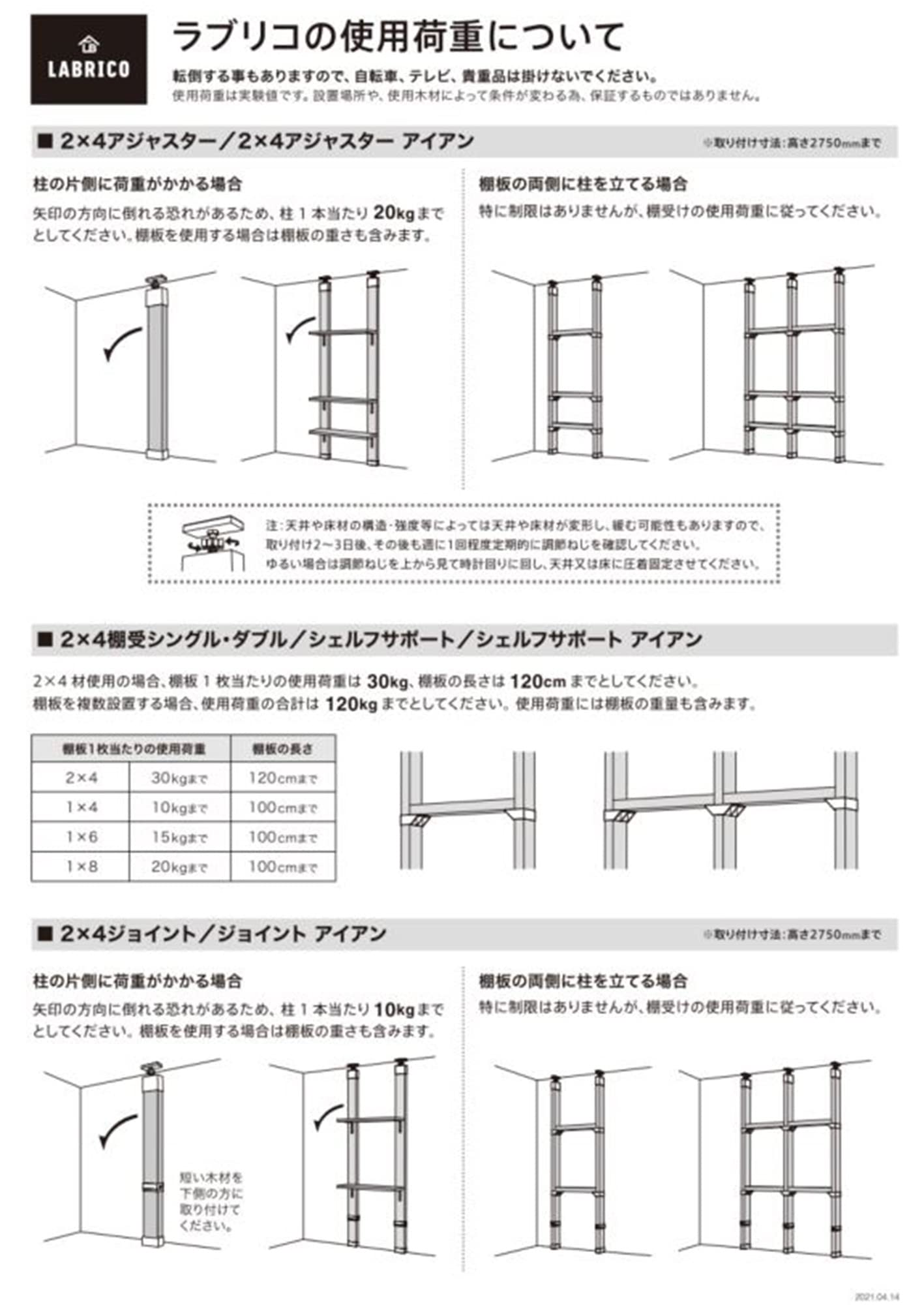 【対応木材】2×4木材【取付寸法】高さ2750mmまで【木材カットの目安】天井の高さから75mm短い木材をご用意ください。