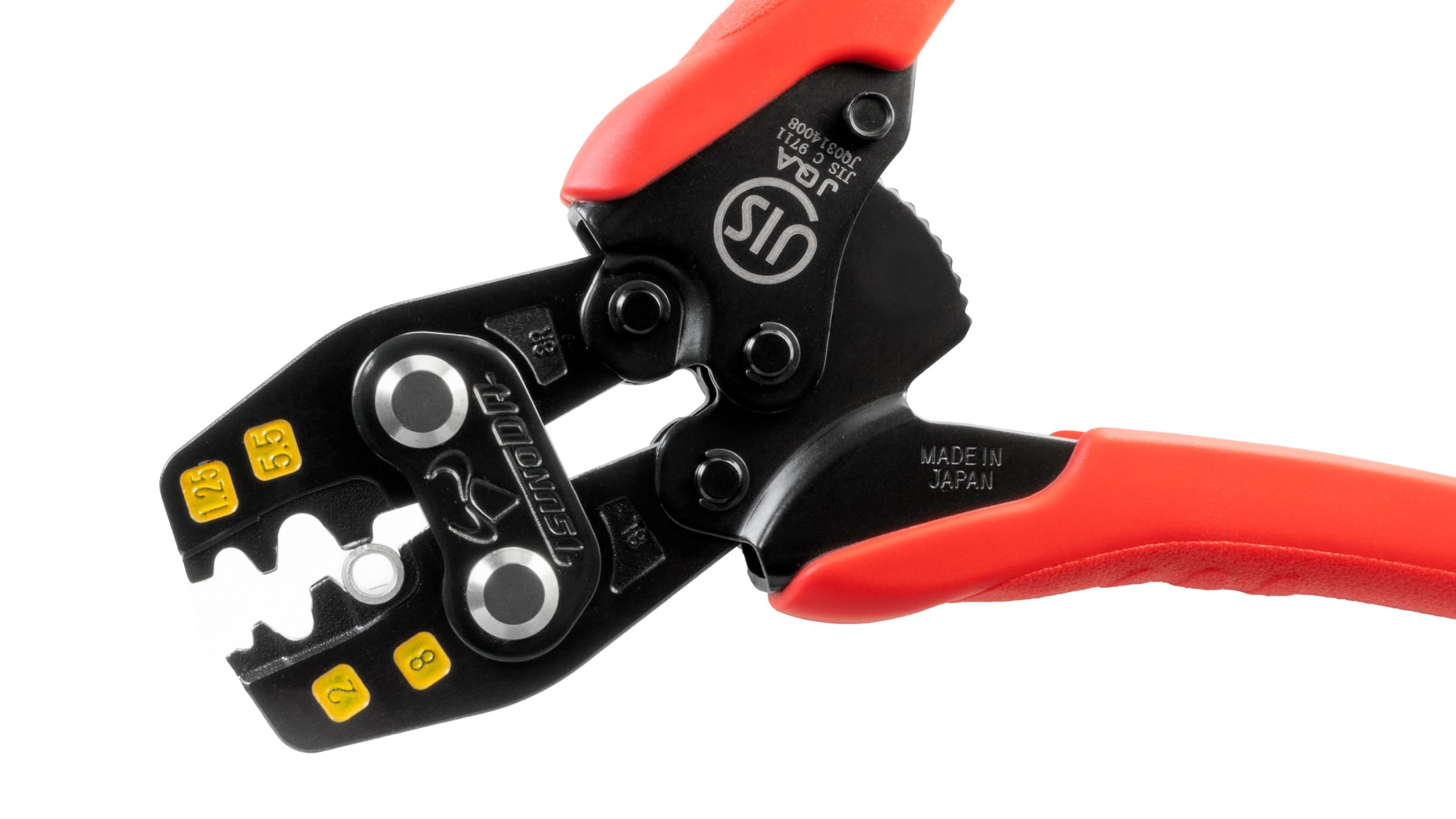 JIS C 9711認証取得商品。安心安全確実スピーディーな圧着。裸圧着端子8まで圧着が可能。グリップは力が入れやすいよう太く・エラストマーグリップを採用し手の負担を軽減。電線挿入作業時に端子がつぶれずに仮押さえができるので作業がスムーズに進みます。安心の日本製。出荷時の全数検査を行いパッケージに検査証封入。