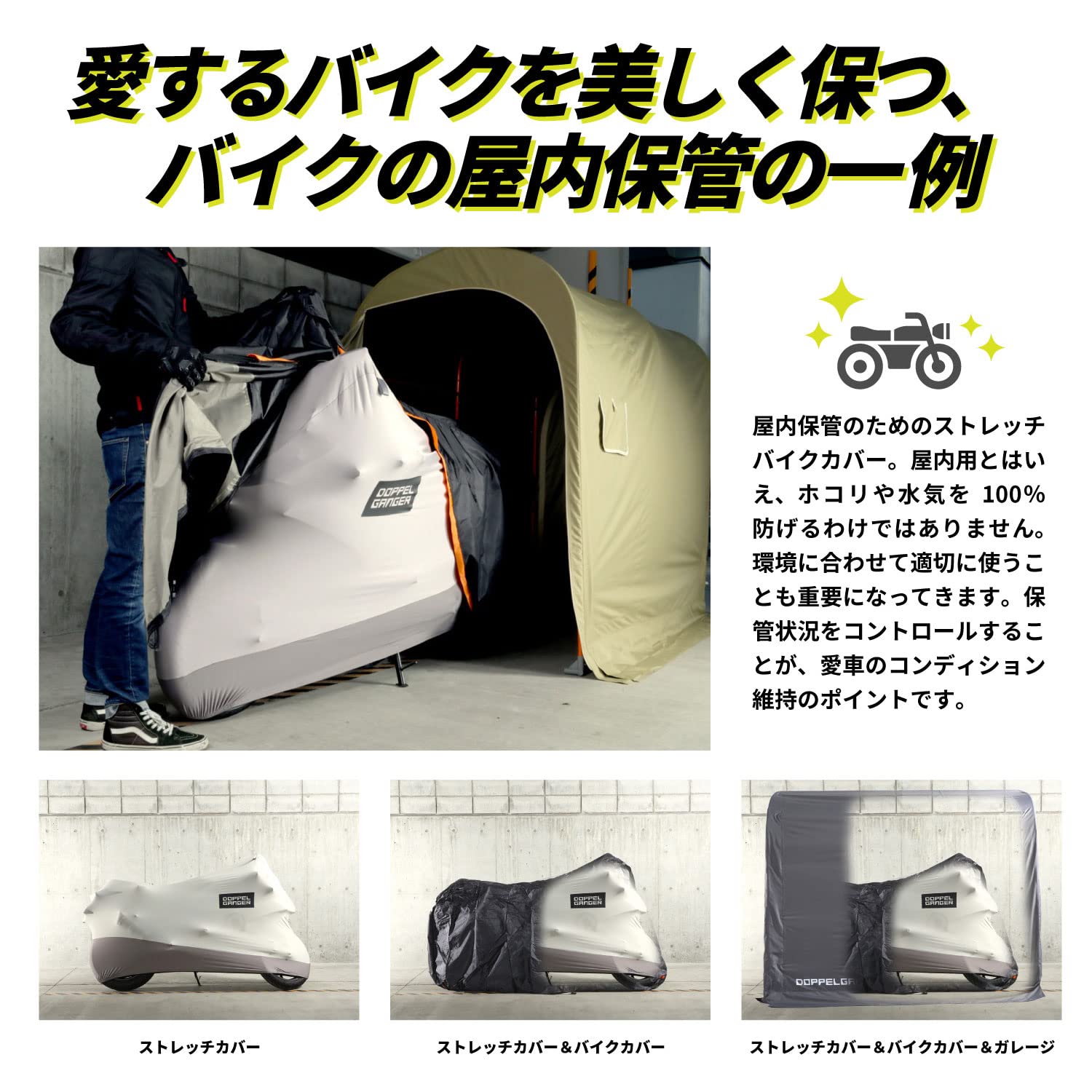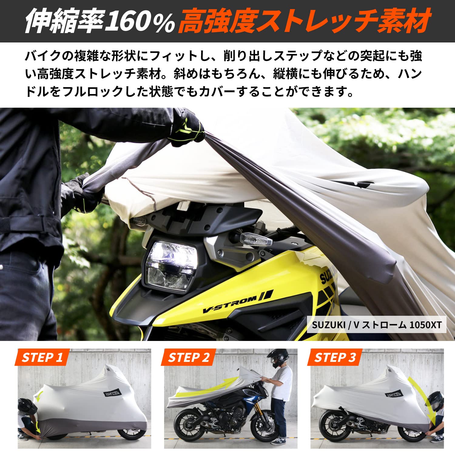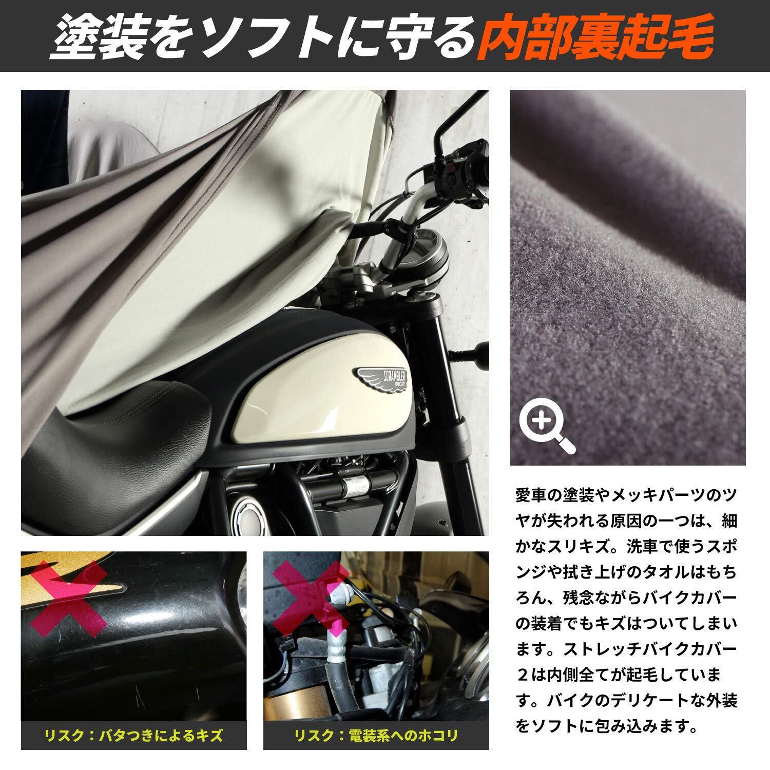 ●アドベンチャー用に大きくなった伸びるカバー 全長はそうでもないのに、背が高くハンドル幅も広いアドベンチャーバイク(オフロードバイク)。 ストレッチバイクカバーADVは、これらのバイクの特徴に合わせて幅と全高を設定。 従来のカバーでは入らなかった車両にかぶせることができます。 ●伸びるからフィット! 伸縮率160%の高強度ストレッチ素材 バイクの複雑な形状にフィットし、削り出しステップなどの突起にも強い高強度ストレッチ素材。 斜めはもちろん、縦横にも伸びるため、ハンドルをフルロックした状態でもカバーすることができます。 愛車の外装を守りつつカバーをフィットさせるため、開口部は160%の有効伸縮率を持たせてあります。 ●カバーの中は全て裏起毛 愛車の塗装やメッキパーツのツヤが失われる原因の一つは、細かなスリキズ。洗車で使うスポンジや拭き上げのタオルはもちろん、 残念ながらバイクカバーの装着でもキズはついてしまいます。ストレッチバイクカバーADVは内側全てが起毛しています。 バイクのデリケートな外装をソフトに包み込みます。 ●ストレッチバイクカバーを使った、屋内保管 屋内保管のためのストレッチバイクカバー。屋内用とはいえ、ホコリや水気を100%防げるわけではありません。 環境に合わせて保管状況をコントロールすることが、愛車コンディション維持のポイントです。 ※バイクガレージ+カバー+ストレッチカバーの保管例(画像はDCC533-GYです) ●立体構造 バイクの形状に合わせた立体構造。ハンドルロックの状態でも、被せやすさとバイクのシルエットを両立します。 ●収納袋 ストレッチバイクカバー本体と共地の収納袋が付属します。