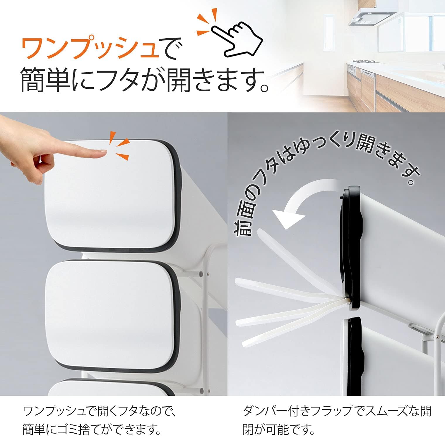 【サイズ】約34×50×高さ122cm 【重量】約7.2kg 【容量】約76L(19L×4段) 【素材・材質】 本体・フタ・袋止めリング・スペーサー・ダンパー・カバー・キャスターソケット・フレームピン:ポリプロピレン、 フラップ:ABS樹脂、 歯車:ナイロン、 フレーム:鋼(紛体焼付塗装)、 ダンパー:ポリカーボネート・ポリアセタール・シリコーンオイル/ ラッチ:ポリアセタール・ナイロン・ステンレス鋼、 キャスター:ナイロン・鋼 【生産国】ベトナム