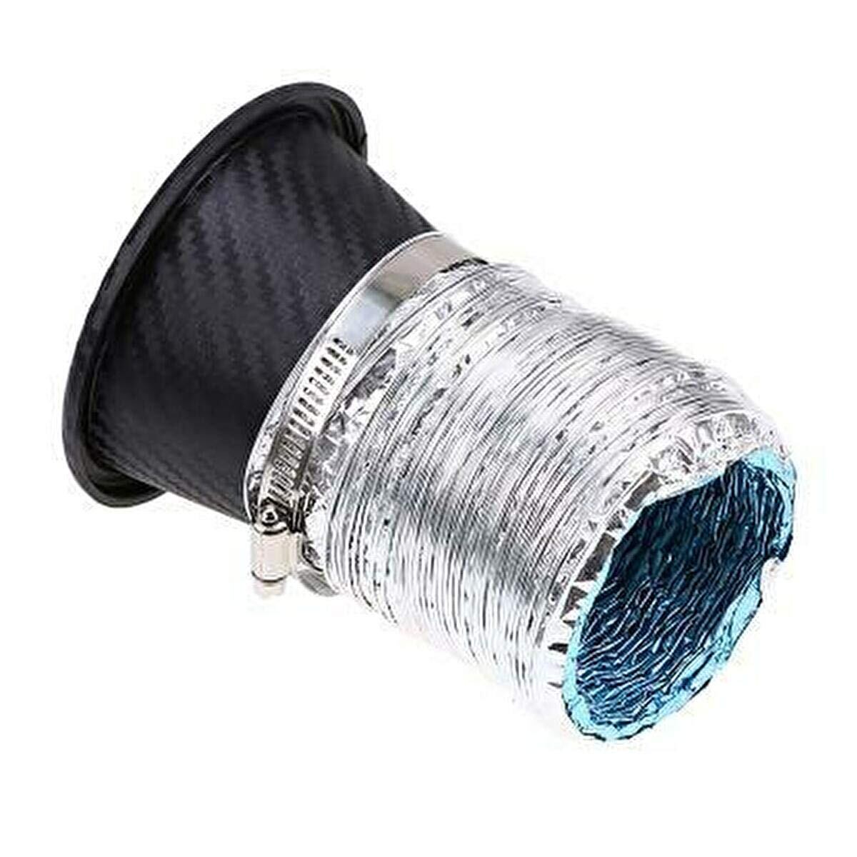 汎用のドライカーボン風エアインテークダクトです。 広い面積でクリーンエアーをキャッチしての吸気冷却、ブレーキ冷却等様々な効果が期待できます。 商品内容 エアインテークダクト本体 1個 取付バンド1個 アルミホース1個 。 フェイクダクトではありませんので付属の蛇腹のアルミホースを使ってインテーク側にエア吸入出来ます。 レーシーなカーボン柄がドレスアップにもなります。 申し訳ありませんが取付等のサポートはできません。十分な知識を持った方での対応をお願いします。