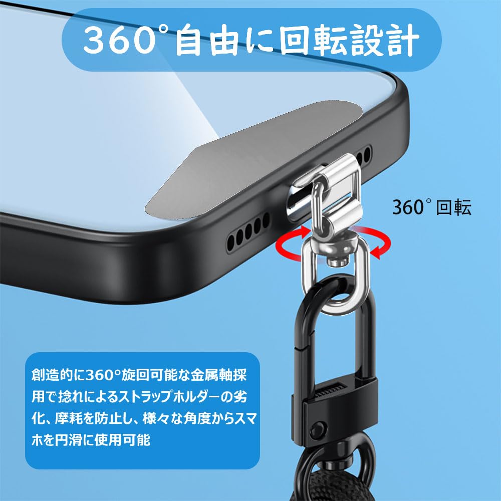 極薄設計、360度回転:製品が屈折しにくく、携帯電話の保護ケースが凸にならないように、私たちの製品はちょうど0.2ミリの薄さで、業界標準に合っています。スリム設計のため、携帯ストラップホルダーは携帯保護カバーを浮き上がらせず、お客様に使いやすいように360回転できるリングバックルも追加しました。