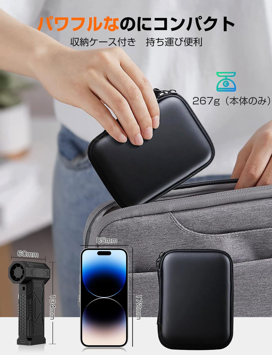 ??【コードレスで携帯用に便利】エアダスターのサイズは134×60×30mm、重量はわずか267gで、手のひらサイズのため片手でも持ちやすいです。また、収納に便利な収納ケースが付属しています。軽量でポータブルな充電式電動エアダスター、軽くて仕事場や車内に持ち運びやすい小型エアダスター。車内のホコリ取りや洗車後の水滴を吹き飛ばす、扇風機、エアコンなど家電のホコリ掃除、車の除雪に、キーボード、マザーボード、CPUクーラー、PCケースなど各パーツのホコリ取り、カメラレンズや光学センサーなど精密機器の掃除、窓、ソファなど部屋のお掃除など幅広い分野活躍します。