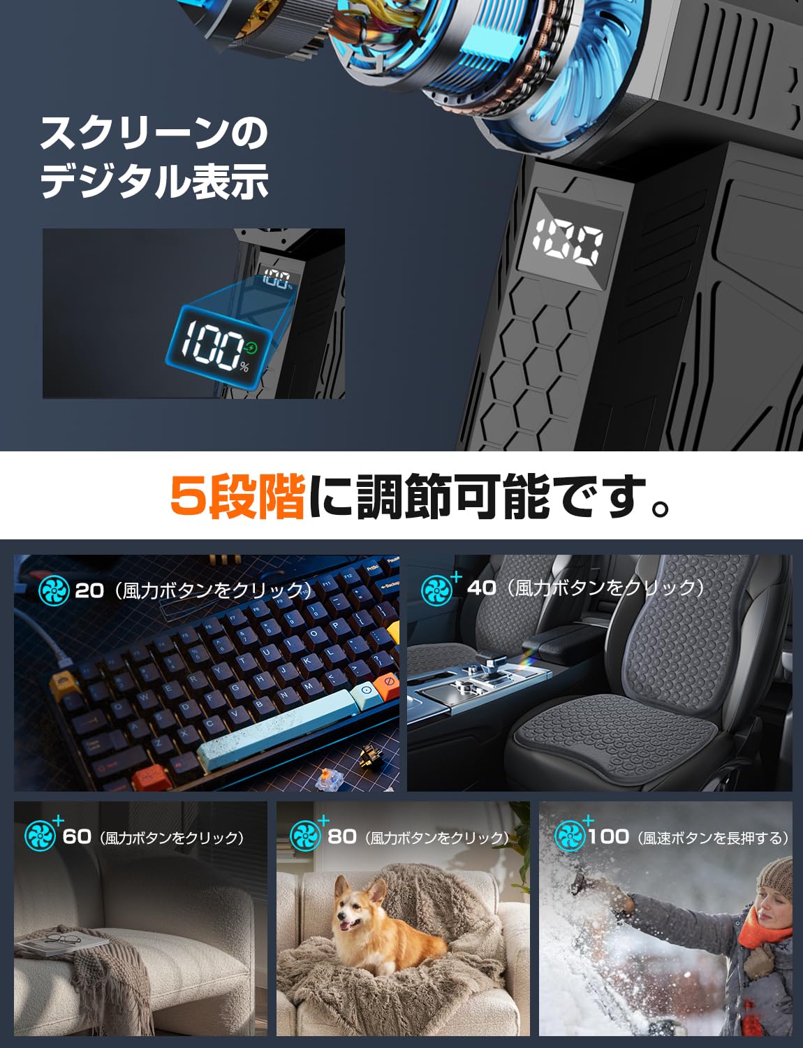 エアダスター 電動エアダスター 洗車 ブロワー 200000RPM高速回転 最大風速 100m/s 5段階風量調整 20000mAh大容量バッテリー LEDライト付き LCDディスプレイ搭 小型で超強力 ブラシレスモーター Type-C充電式 小型軽量 過熱保護 充電式エアダスター 2種類ノズル付き PC掃除/キーボード/エアコン/洗車用 収納ボックス付き ブラシ付き 日本語取扱説明書付き