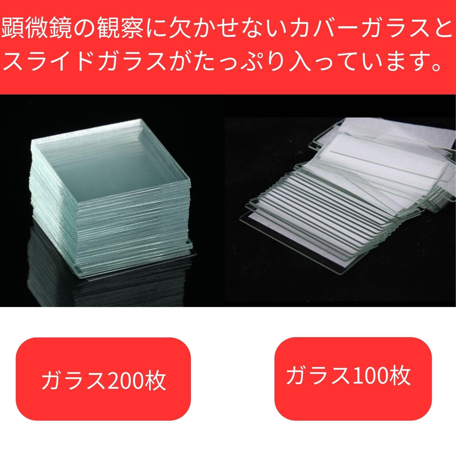 スライドガラス100枚、カバーガラス200枚の大容量セット:顕微鏡の観察に欠かせないカバーガラスとスライドガラスがたっぷり入っています。プレパラートの交換が簡単で、理科の実験や研究に最適です。お子様の顕微鏡でも使用可能です。