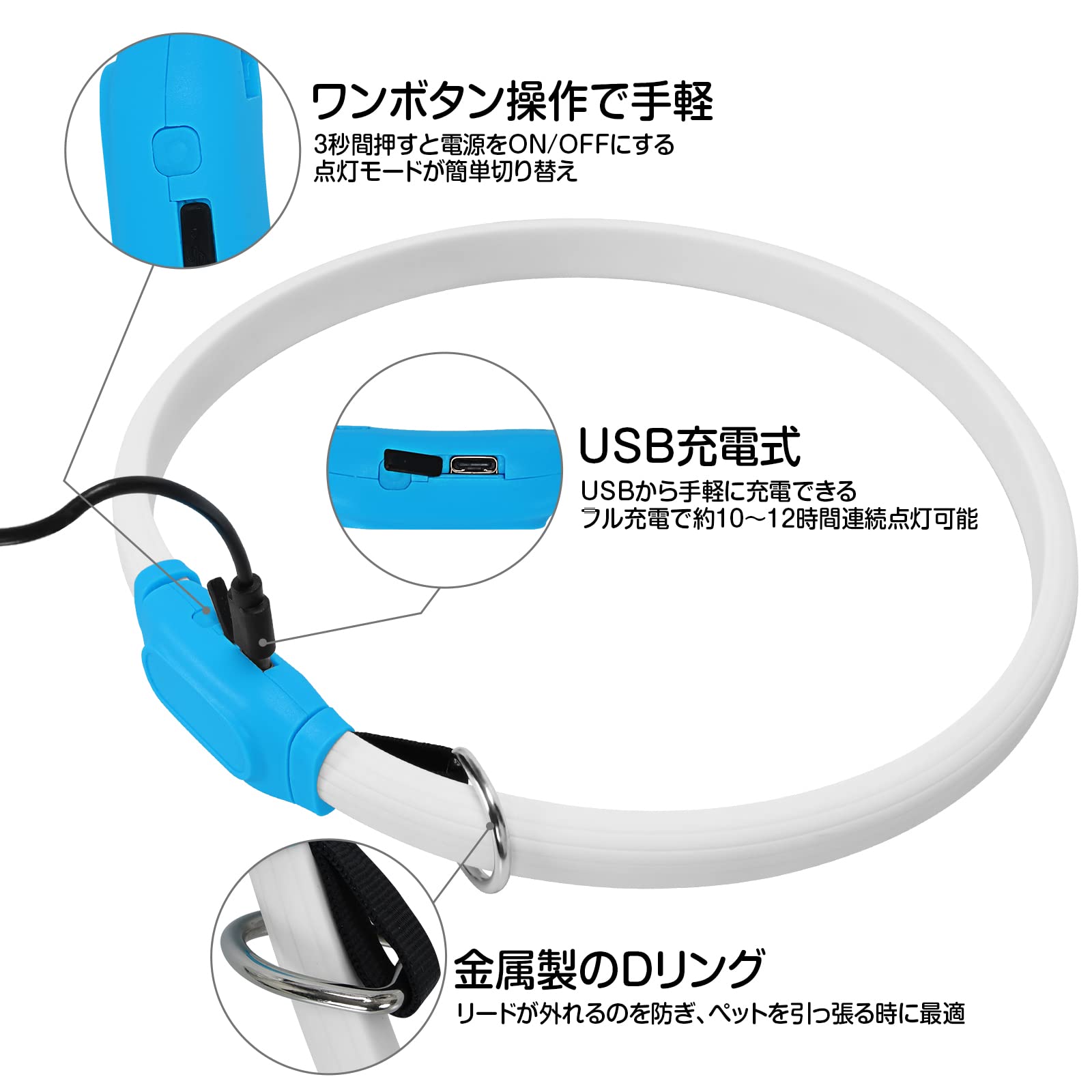 【USB充電式・長時間点灯】ペットLED首輪はUSB充電式なので電池はいらず、経済的で省エネ。約2時間でフル充電でき、約10〜12時間の連続点灯ができます。防水効果ありますので、雨など水が普通に飛び散り付着する場合は大丈夫です。ティッシュや毛布などで拭き取ればいいです。バッテリーの部分に水が入らないようにご注意ください。