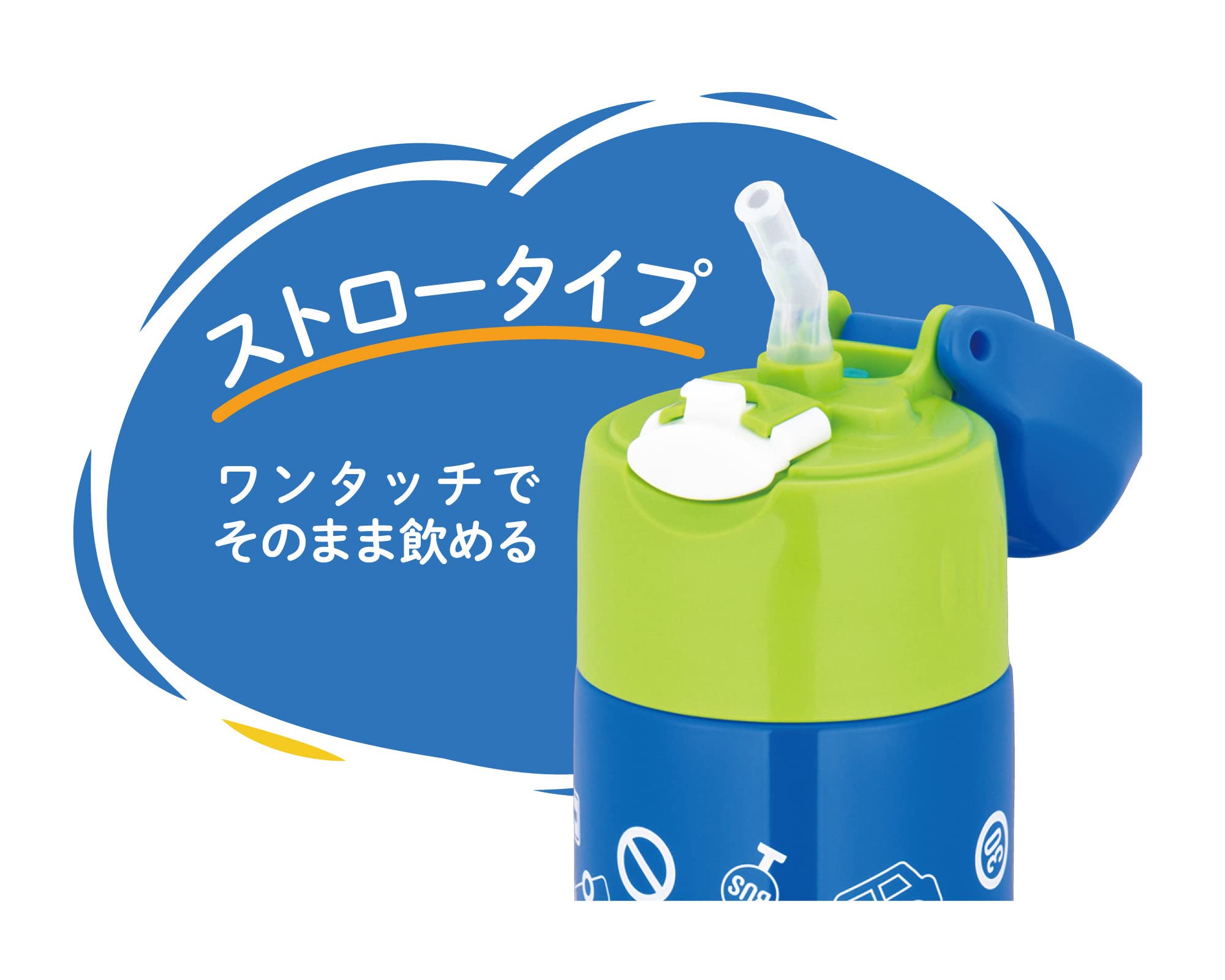 素材・材質:内びん/ステンレス鋼、胴部/ステンレス鋼(アクリル樹脂塗装)、フタ・キャップ本体/ポリプロピレン、飲み口/シリコーンゴム、ストロー/ポリエチレン、バルブ/シリコーンゴム、パッキン/シリコーンゴム
