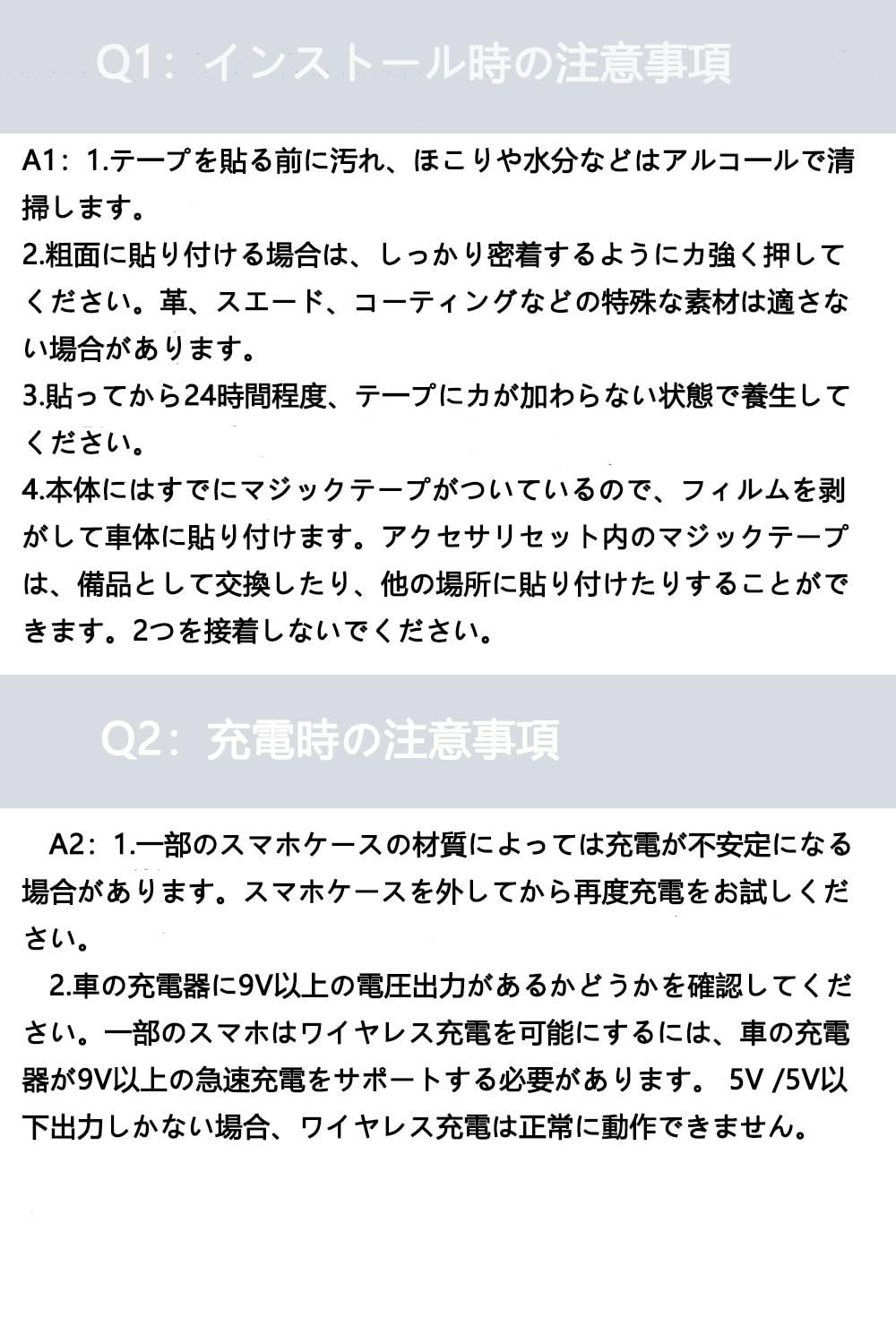 幅広い互換性:テープを使用するため、車内のダッシュボードやモニターなど平らな表面に取り付けることができます。運転の習慣により適合な位置を選んできます。また、Magsafe対応のスマホ(iPhone 12シリーズ以降)はホルダーを置くで直接に充電可能だけではなく、付属のメタルプレ一トまたはMagsafeアクセサリ一を利用して、Magsafe機能ないのAndroidスマホも使用可能です。※Magsafeスマホケースを使用した場合は付属のメタルプレ一トを使用しないでください。