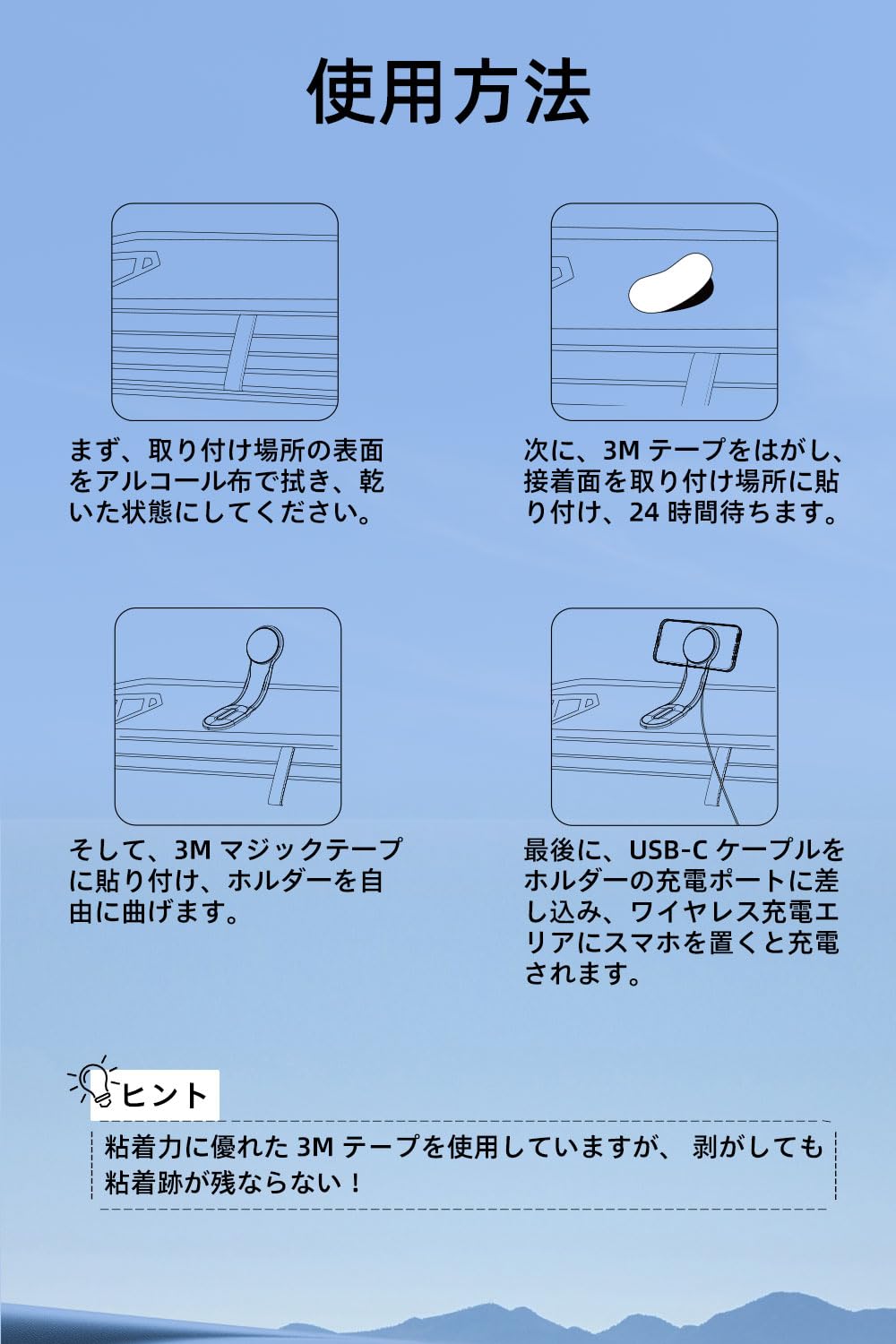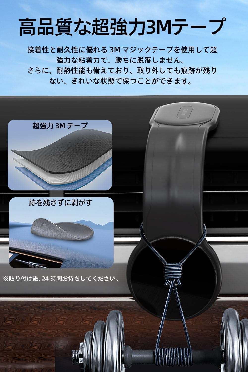 粘着力に優れる:ホルダーの固定底部は両面テープを使用し、強力な粘着力を持っており、スマートフォンホルダーを安定に取り付けることができます。さらに、使用されるテープは耐熱性があり、長期間の使用でも劣化せず、安定した性能を維持します。取り外す際には跡を残さずに簡単に取り外すことができます。※貼り付け後、24時間お待ちしてください。