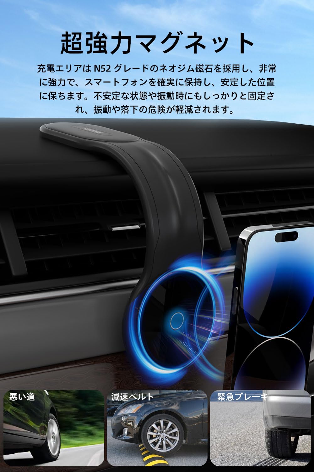 最大15W出力可能:吸着エリアはワイヤレス充電技術を搭載しており、5W/7.5W/10W/15Wの出力に対応します。最大15Wの高出力でスマホへ急速充電できるホルダーです。スマホがホルダーを置くだけですぐに充電可能で、運転中でも快適に充電できます。※ワイヤレス充電対応できるスマホに適用します。【ご注意:車の充電器に9V以上の電圧出力があるかどうかを確認してください。一部のスマホはワイヤレス充電を可能にするには、車の充電器が9V以上の急速充電をサポートする必要があります。5V 出力しかない場合、ワイヤレス充電は正常に動作できません。】